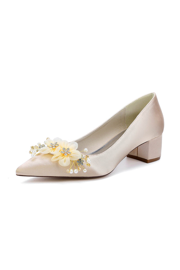 Flowers Pearl Pointed Toe Slip-on Chunky Heels