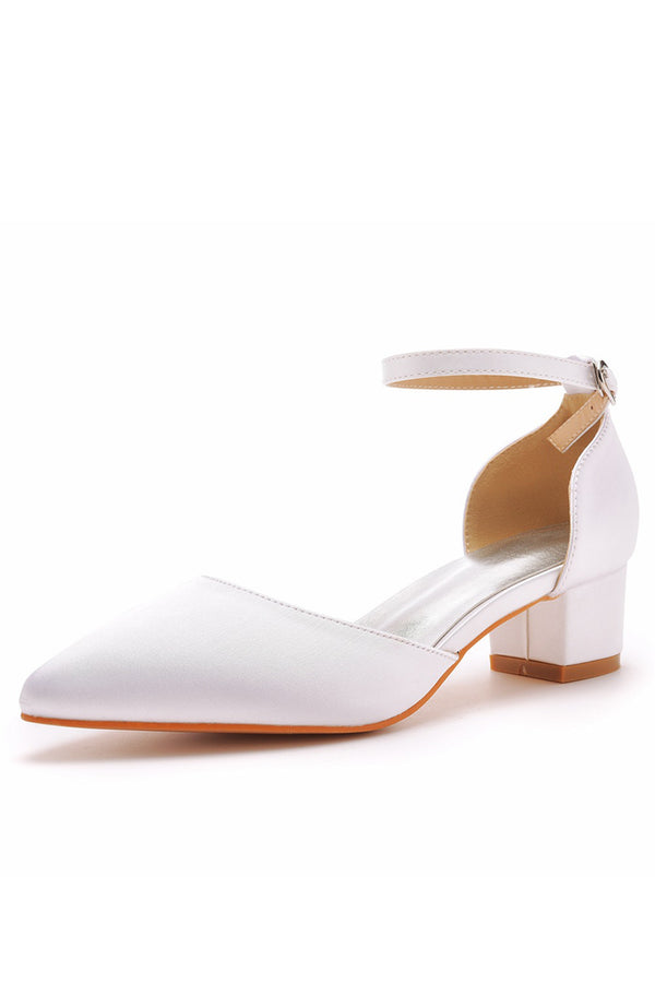 Simple White Satin Pointed-toe Chunky Heels Ankle Strap Mid Heels