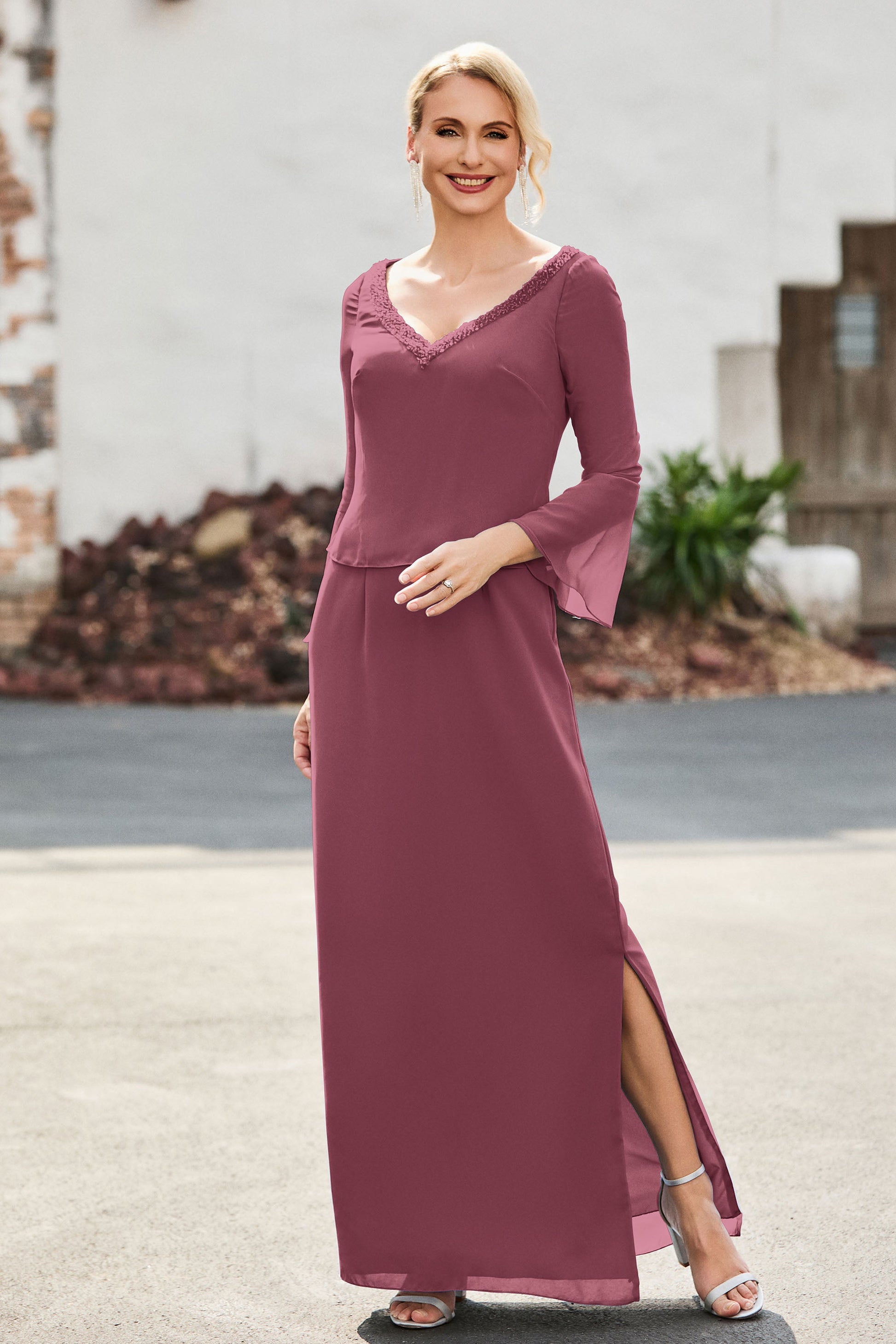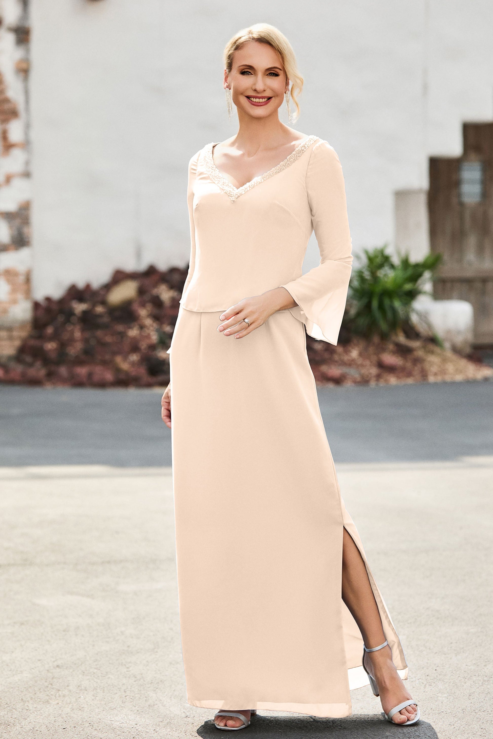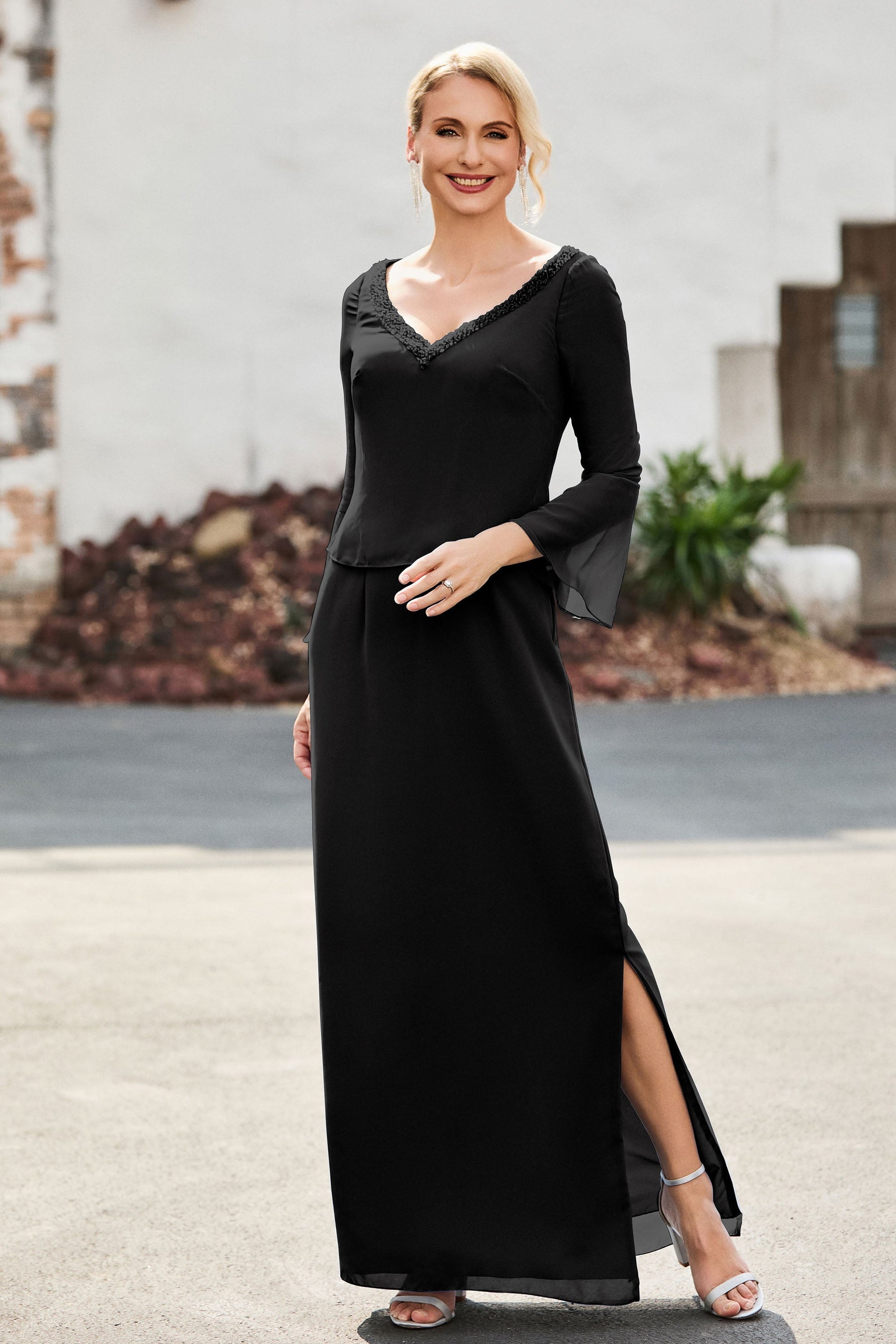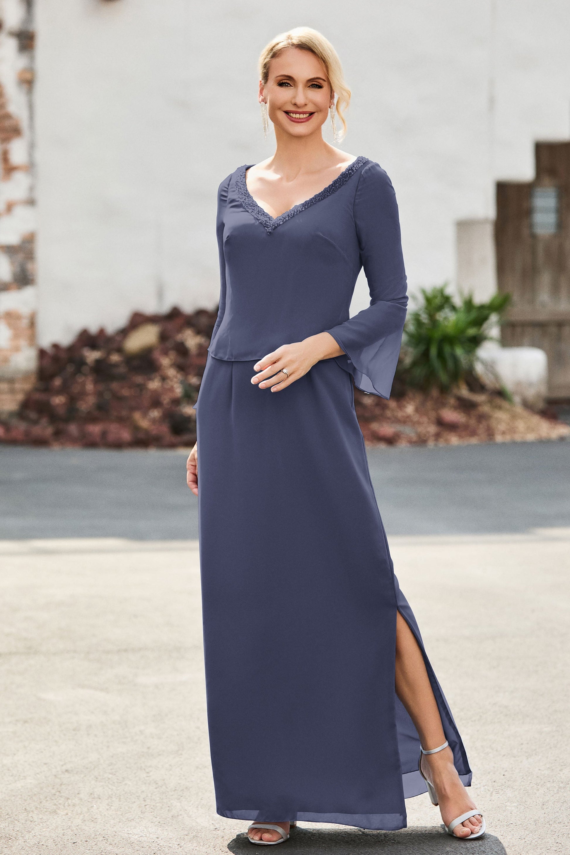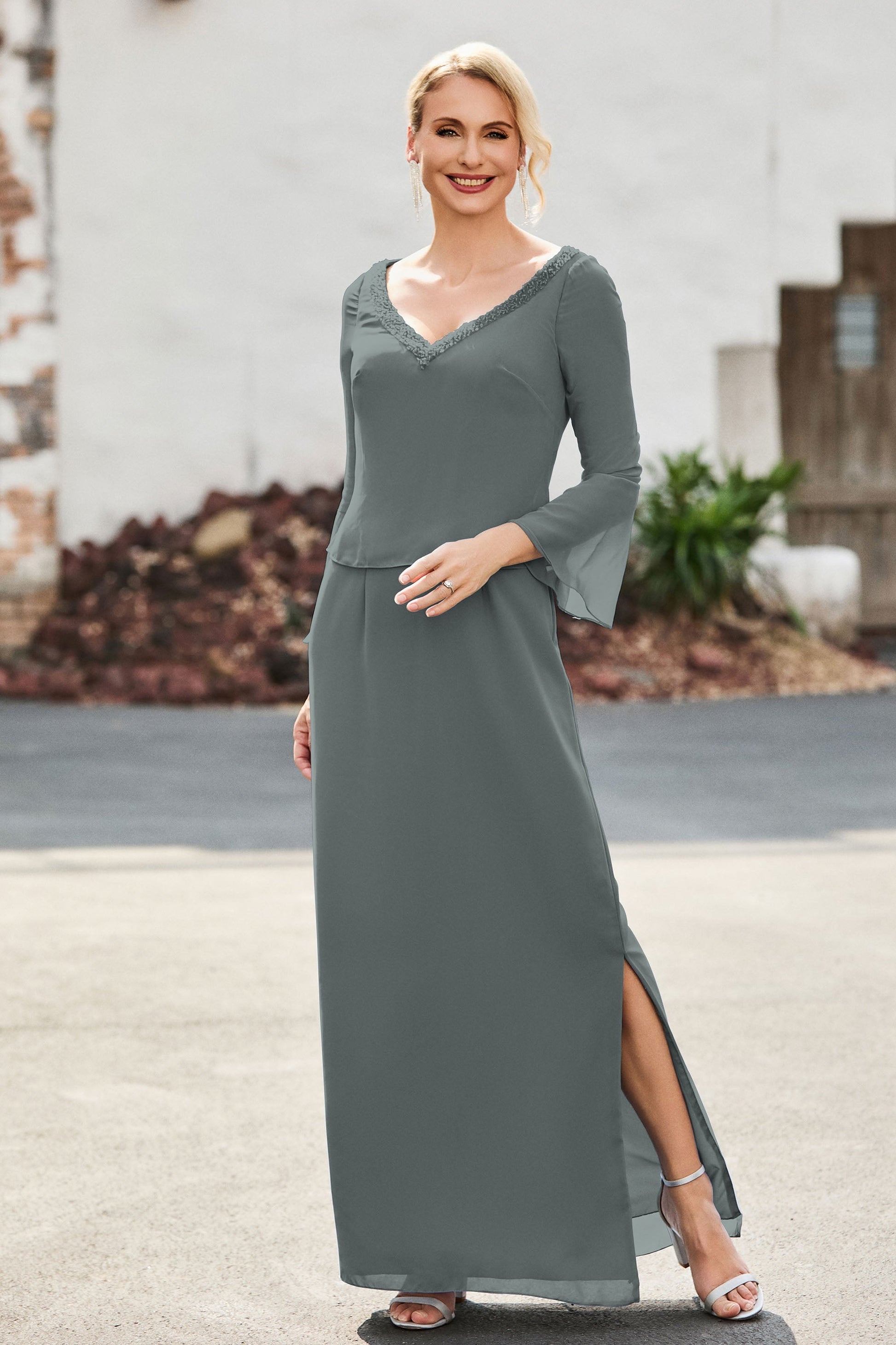 This dress features a flattering sheath silhouette, with a beaded v-neckline that exudes sophistication. A side slit adds graceful movement, while delicate beaded embellishments provide a hint of sparkle, enhancing its elegant charm. Perfect for formal occasions, this dress blends timeless style with modern glamour.
