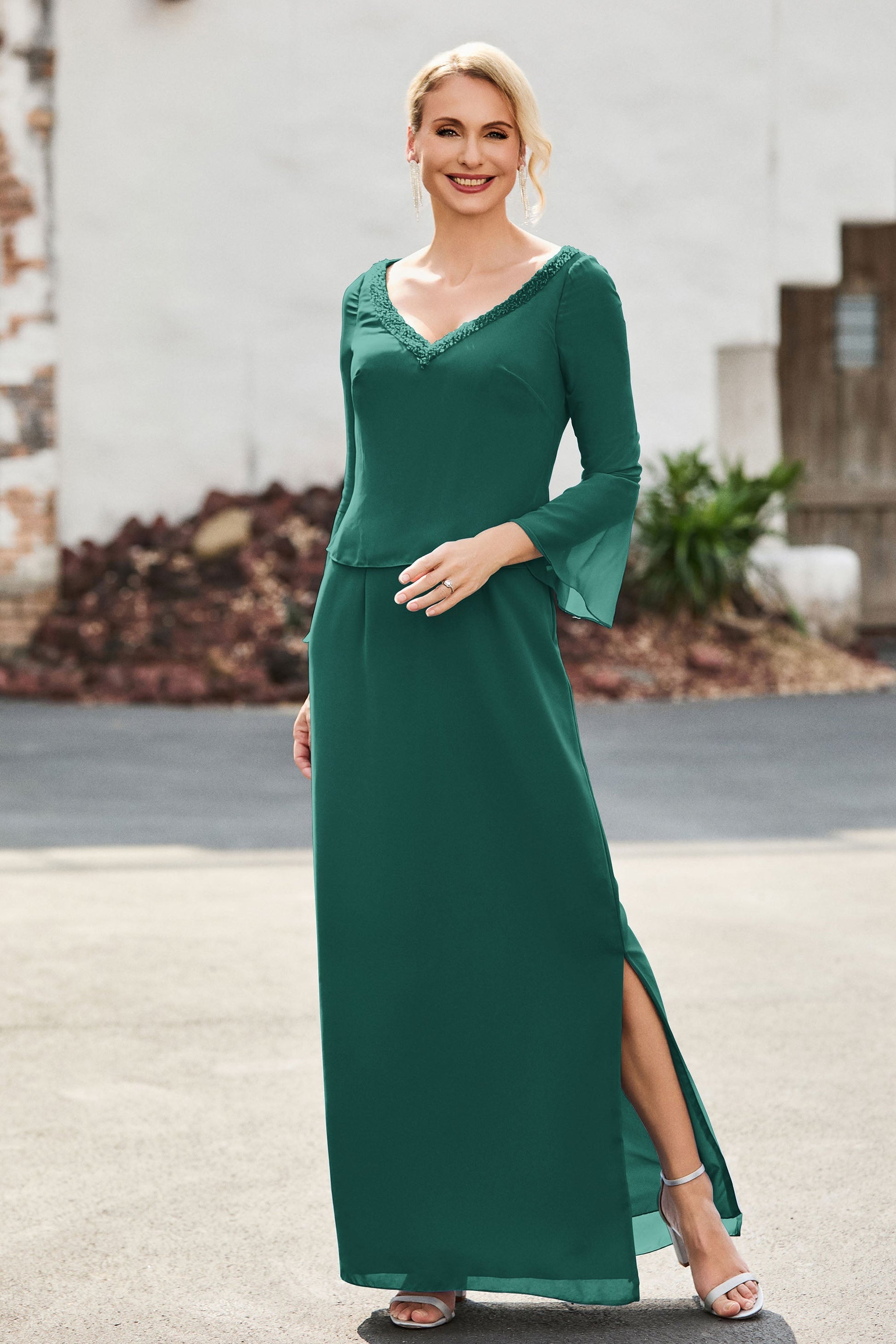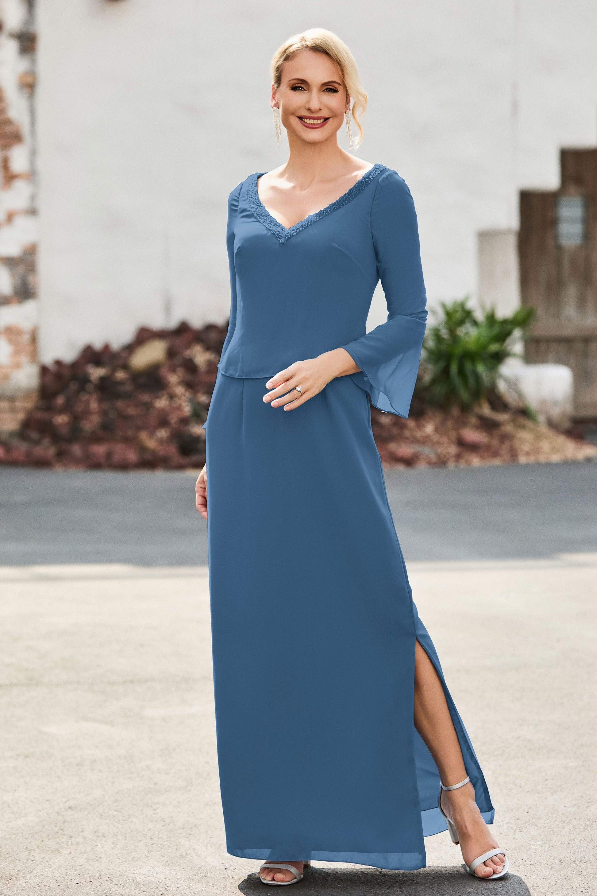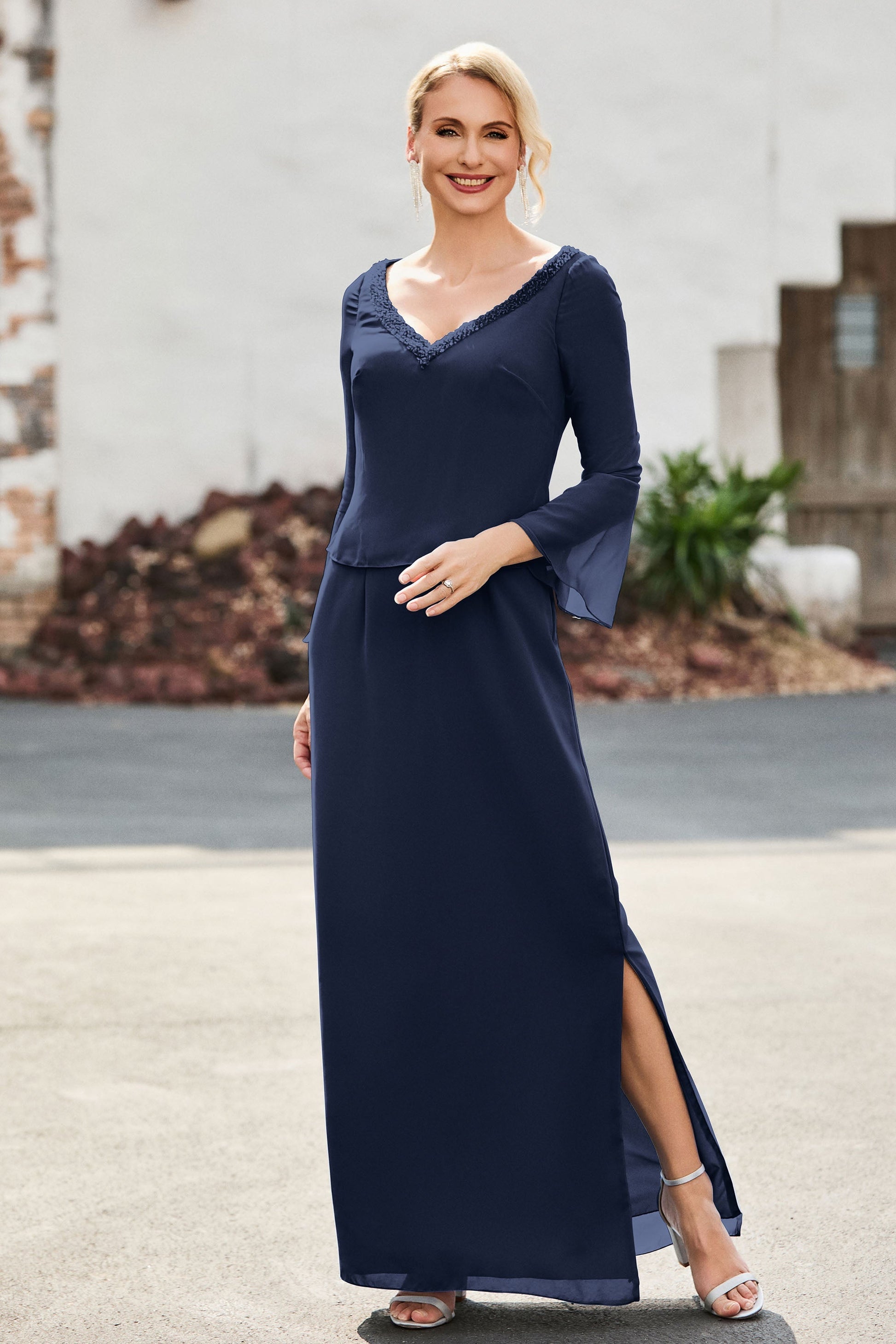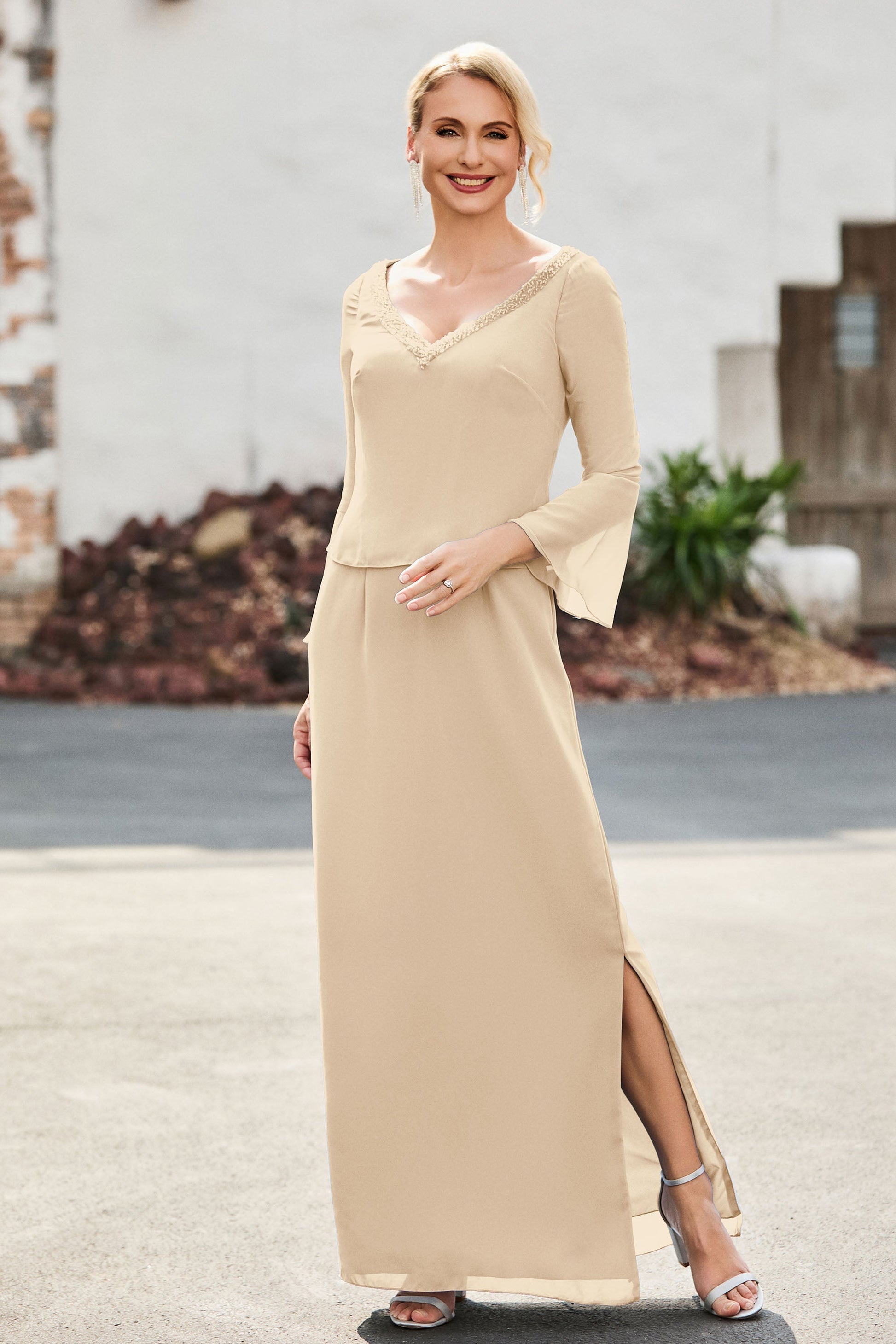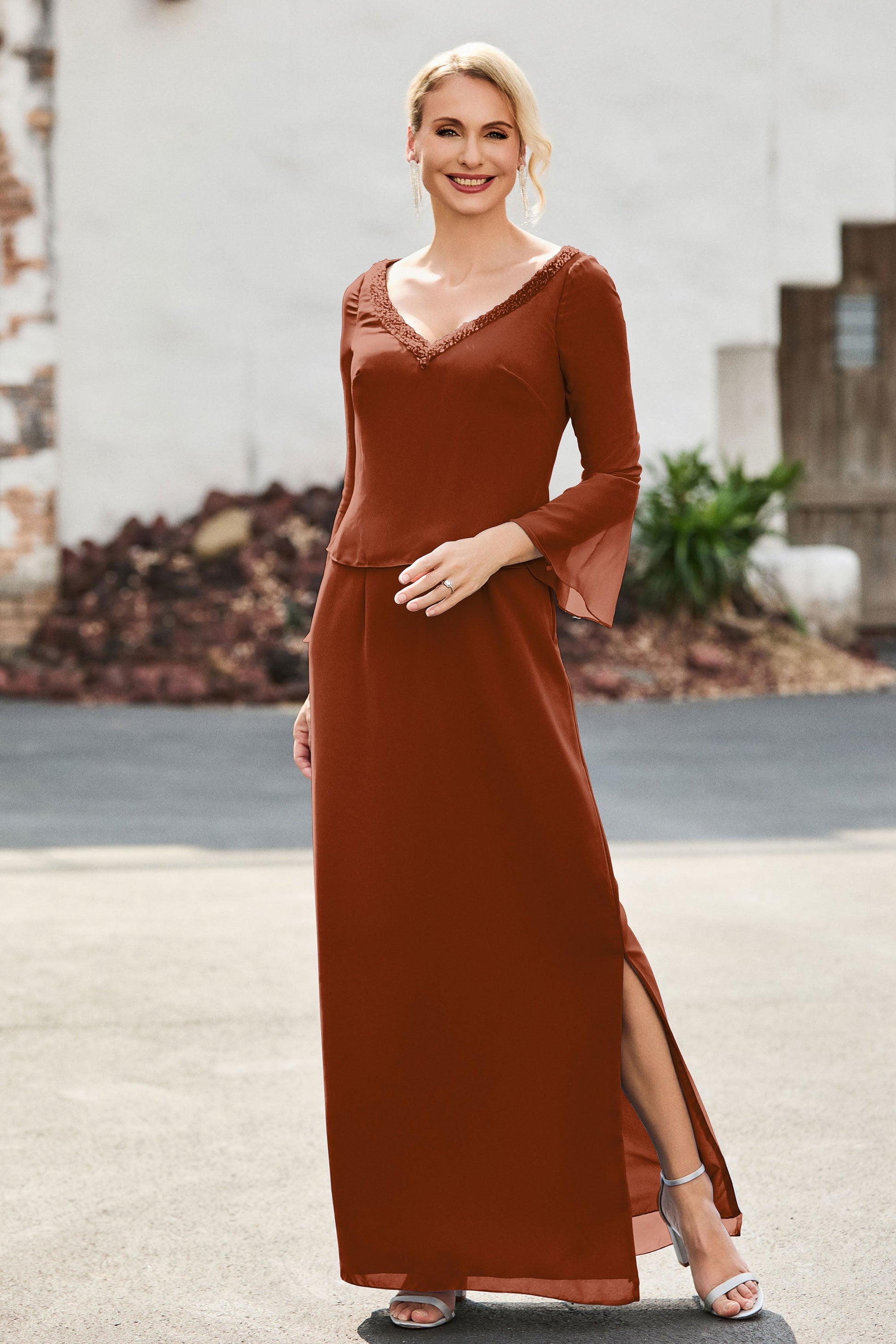This dress features a flattering sheath silhouette, with a beaded v-neckline that exudes sophistication. A side slit adds graceful movement, while delicate beaded embellishments provide a hint of sparkle, enhancing its elegant charm. Perfect for formal occasions, this dress blends timeless style with modern glamour.