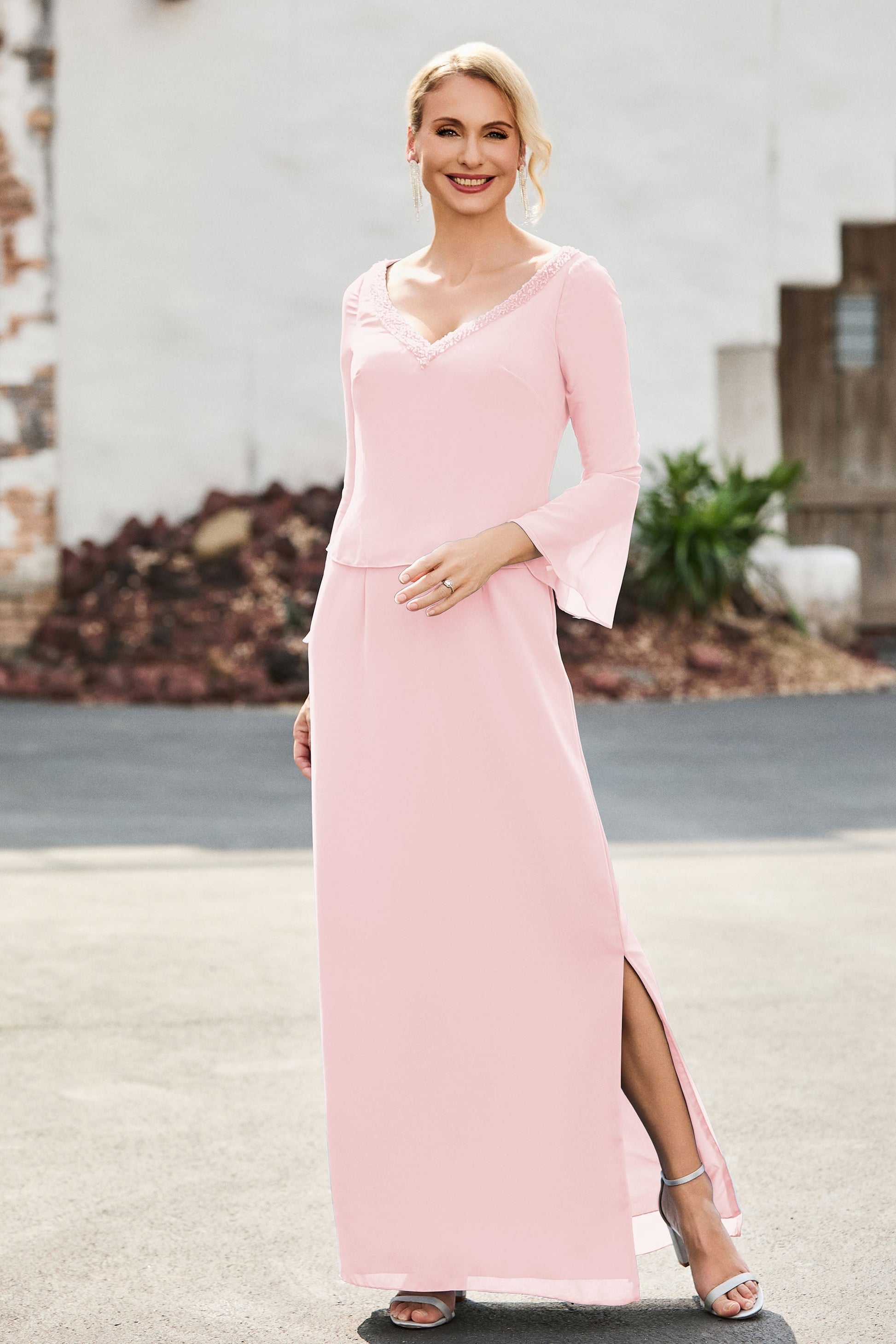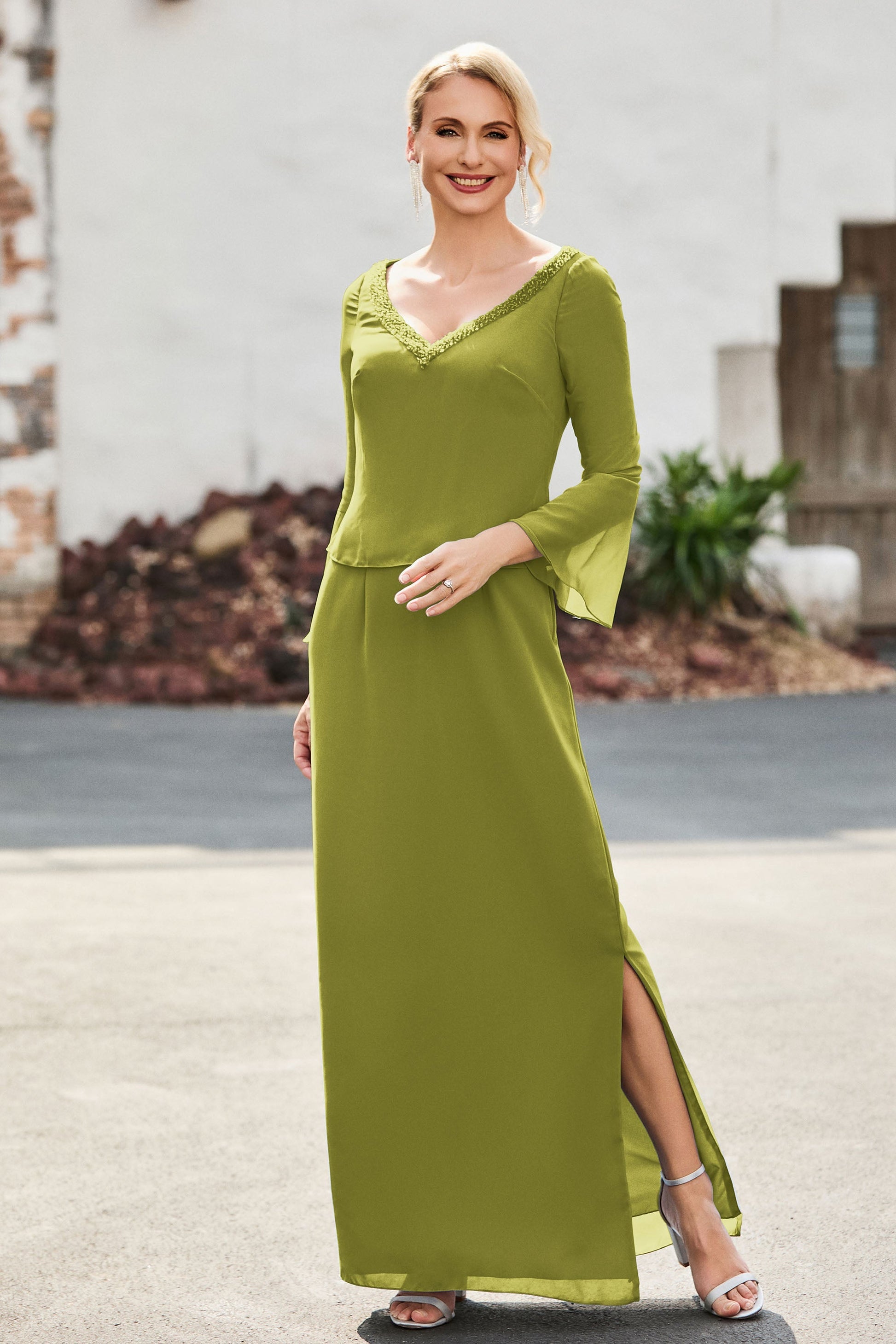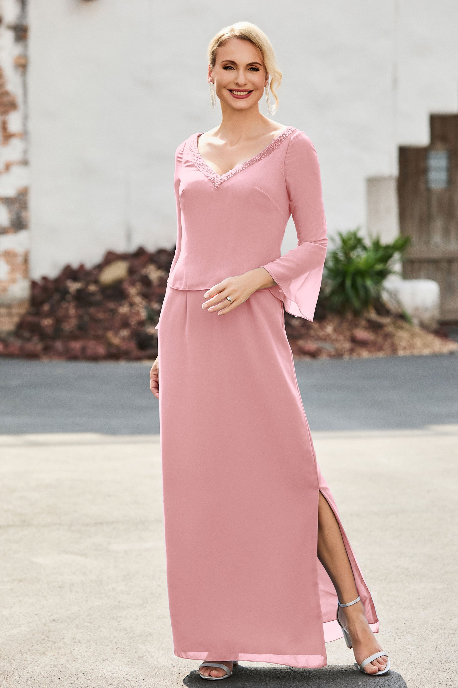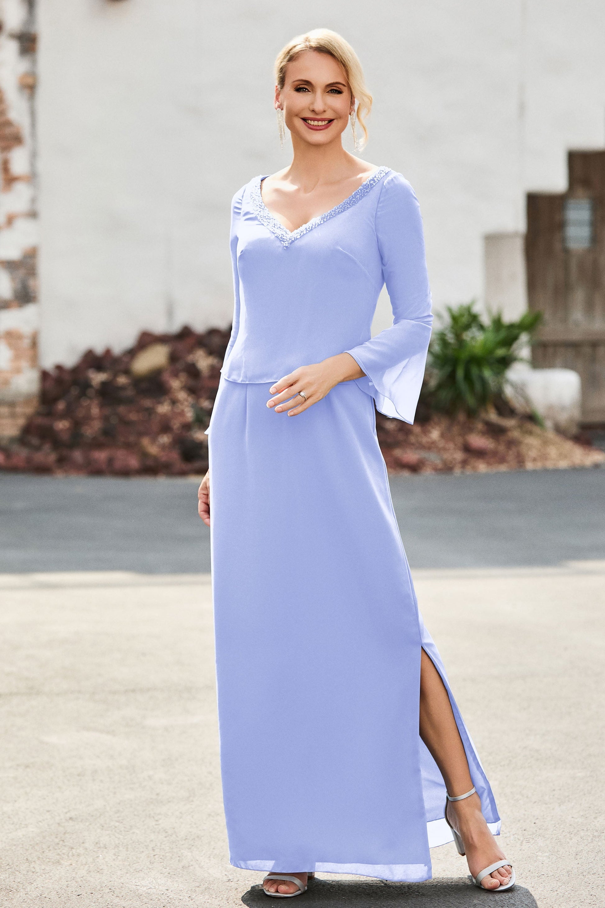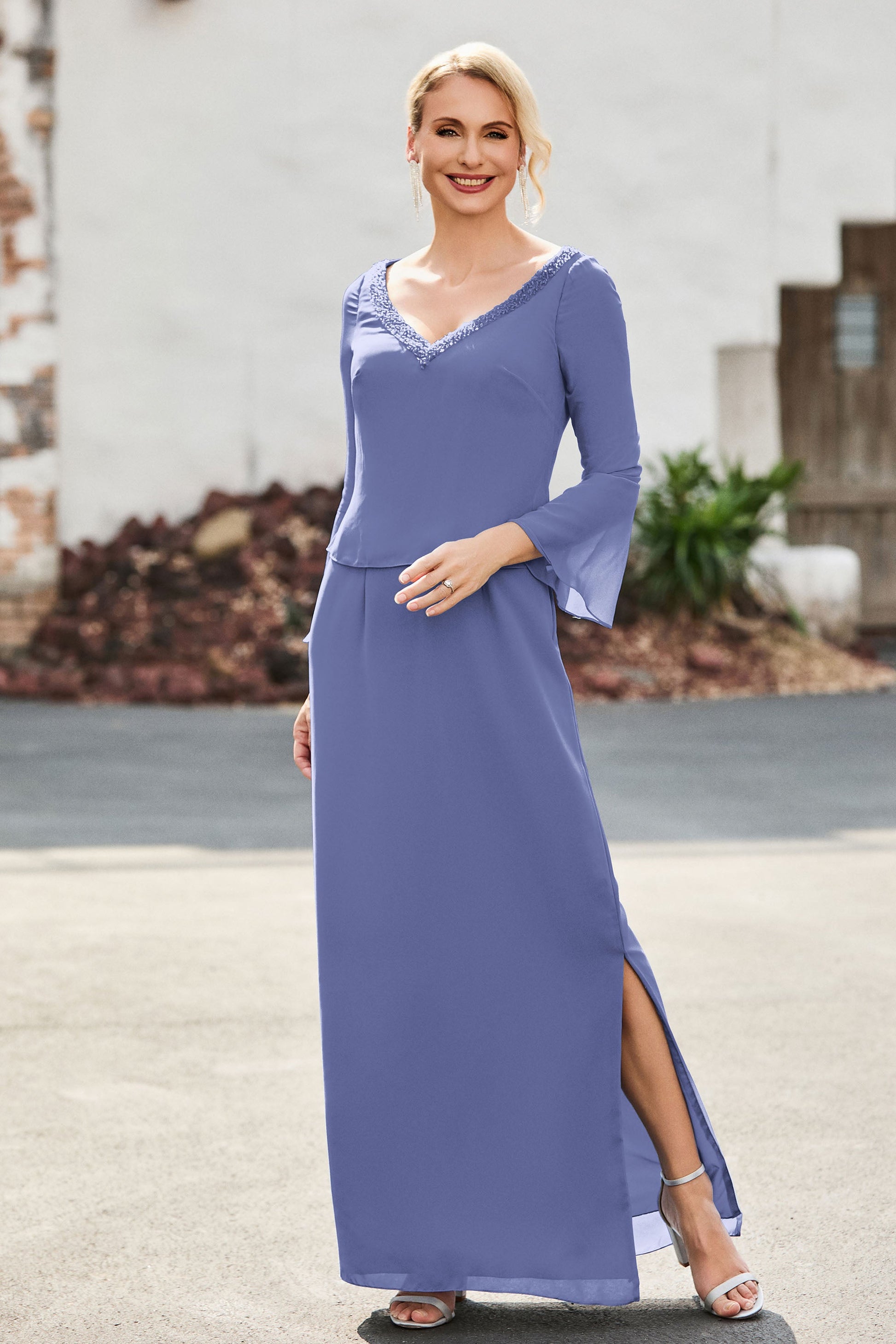 This dress features a flattering sheath silhouette, with a beaded v-neckline that exudes sophistication. A side slit adds graceful movement, while delicate beaded embellishments provide a hint of sparkle, enhancing its elegant charm. Perfect for formal occasions, this dress blends timeless style with modern glamour.