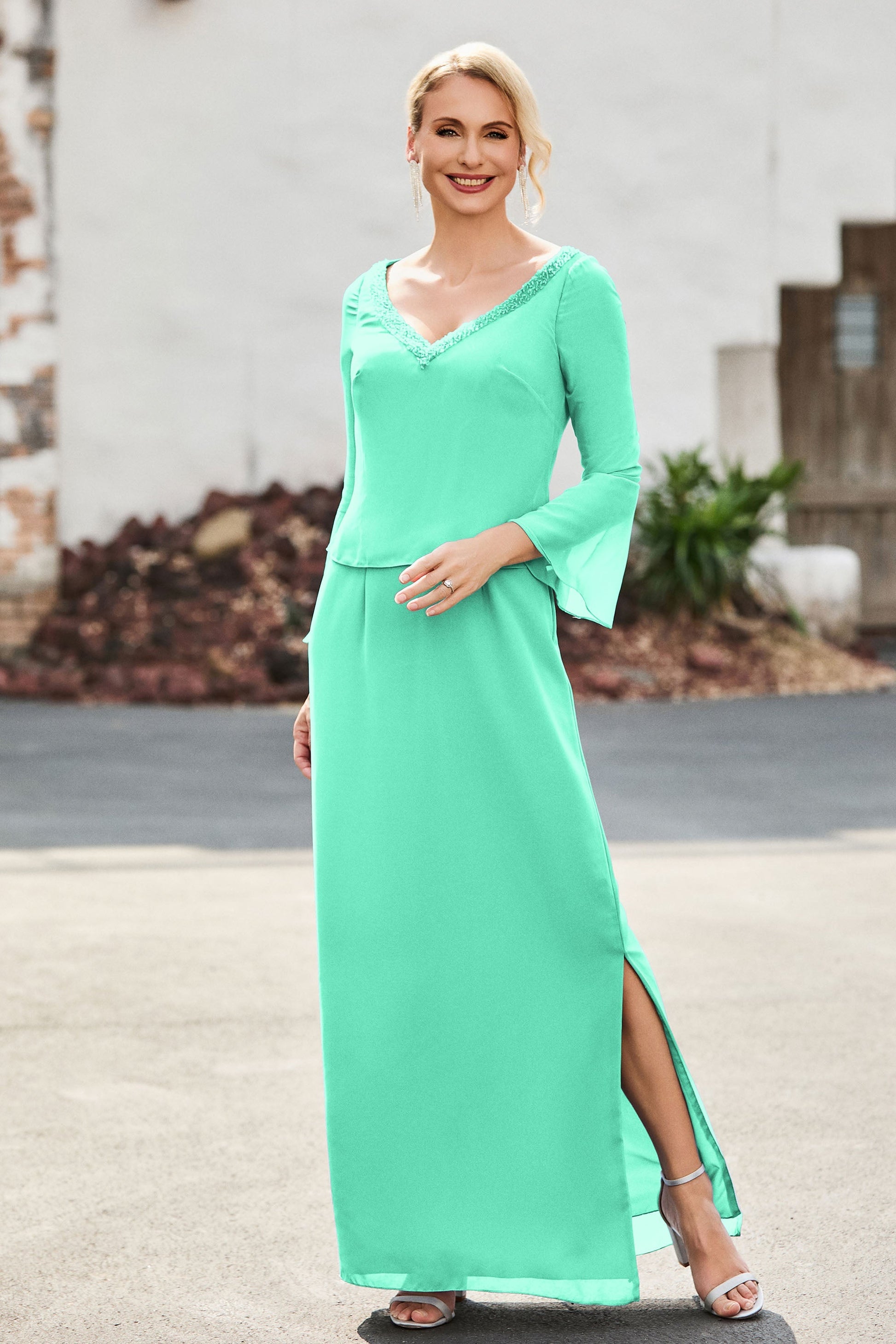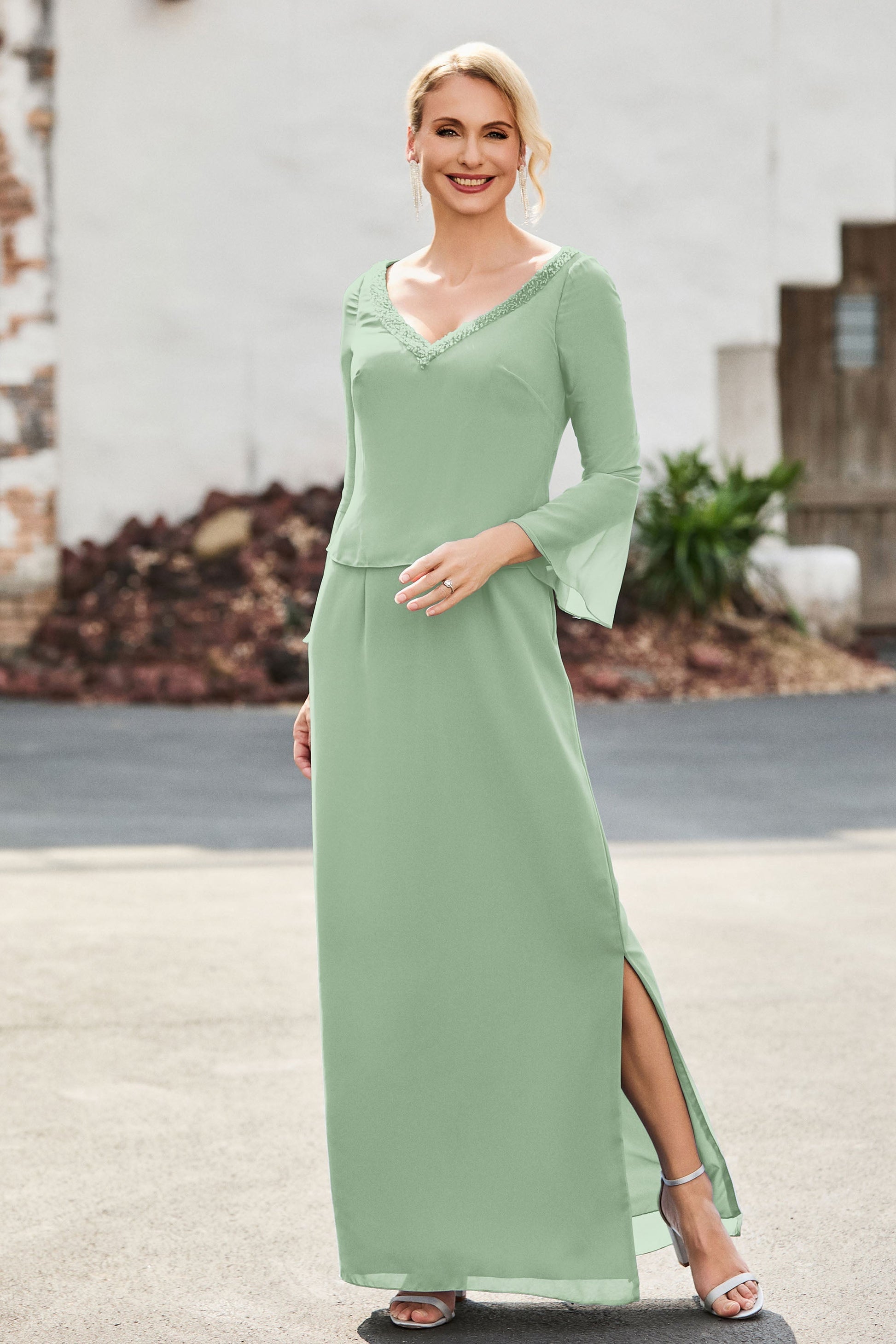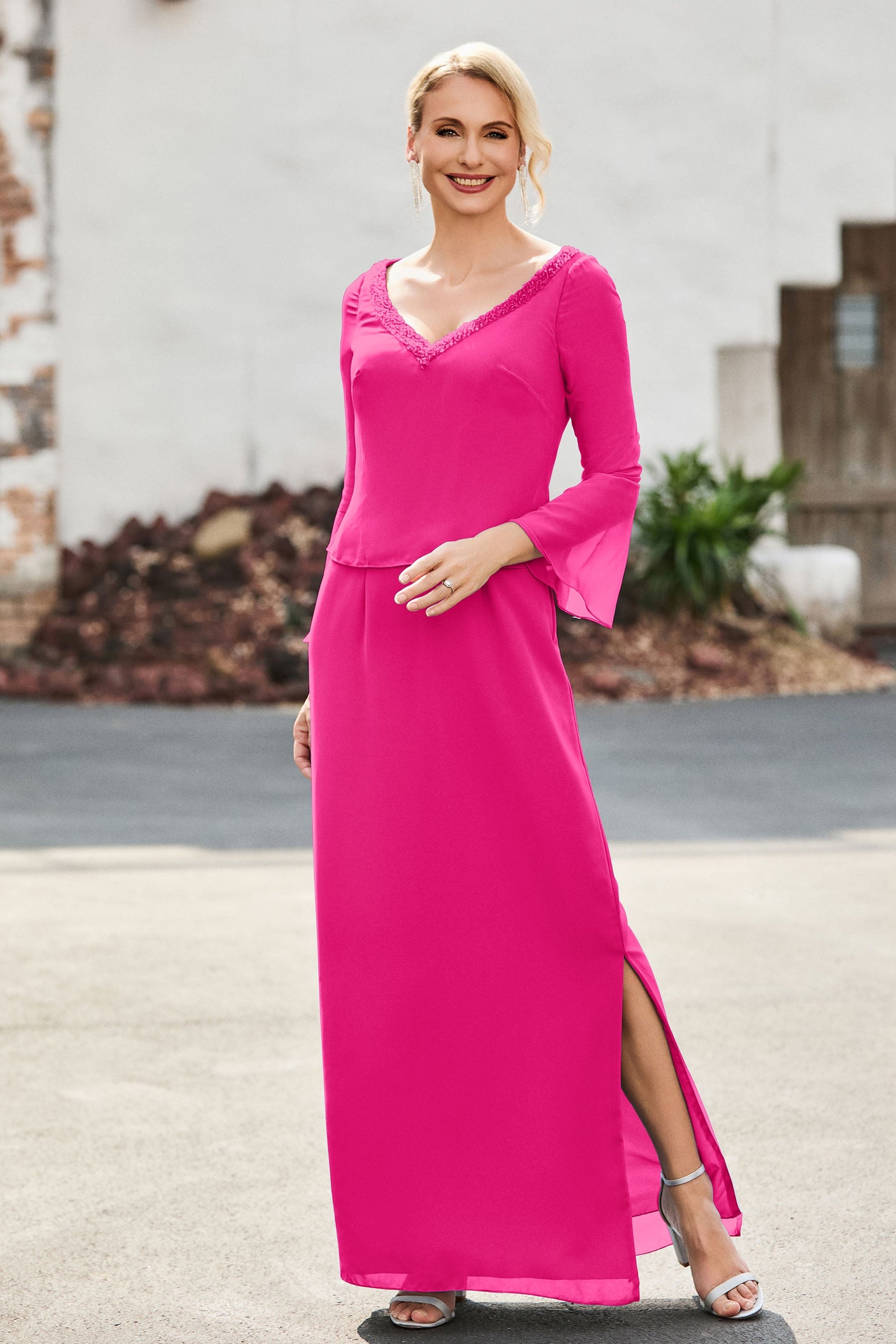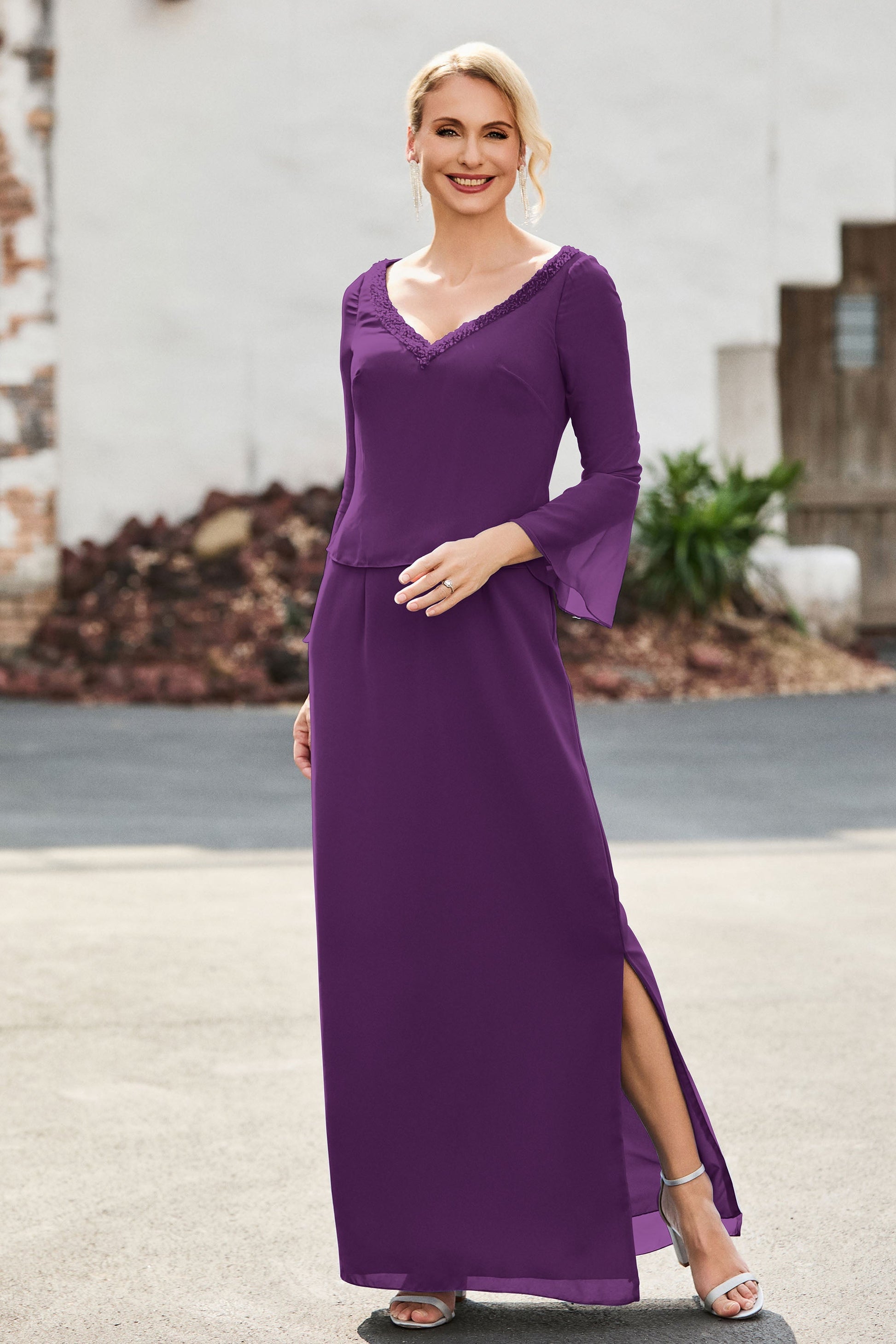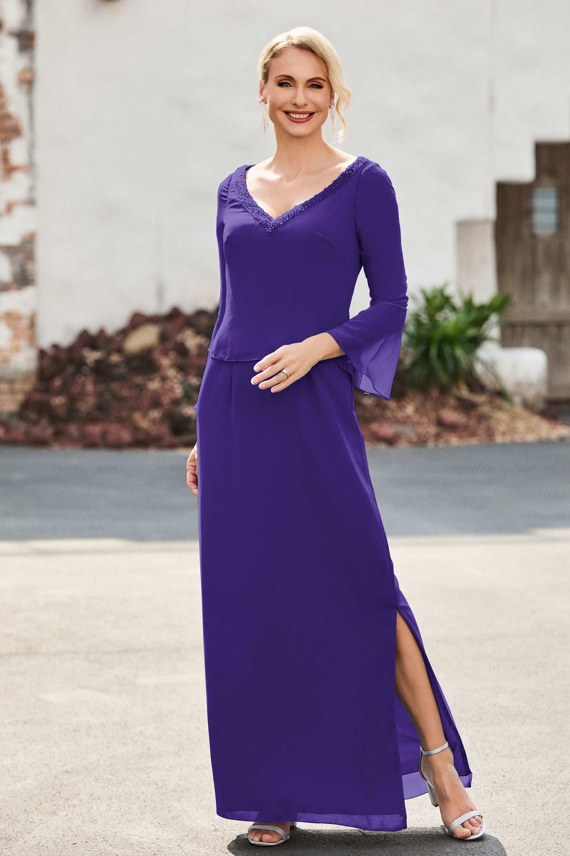 This dress features a flattering sheath silhouette, with a beaded v-neckline that exudes sophistication. A side slit adds graceful movement, while delicate beaded embellishments provide a hint of sparkle, enhancing its elegant charm. Perfect for formal occasions, this dress blends timeless style with modern glamour.