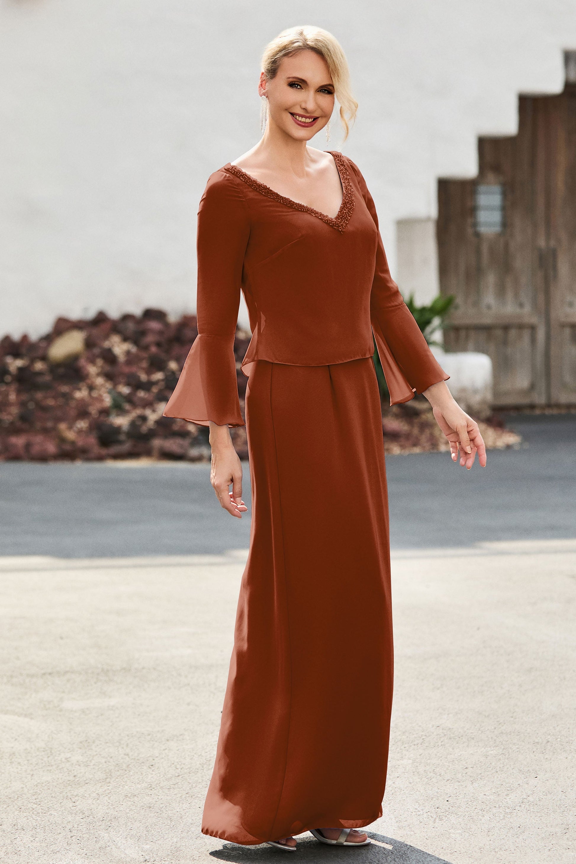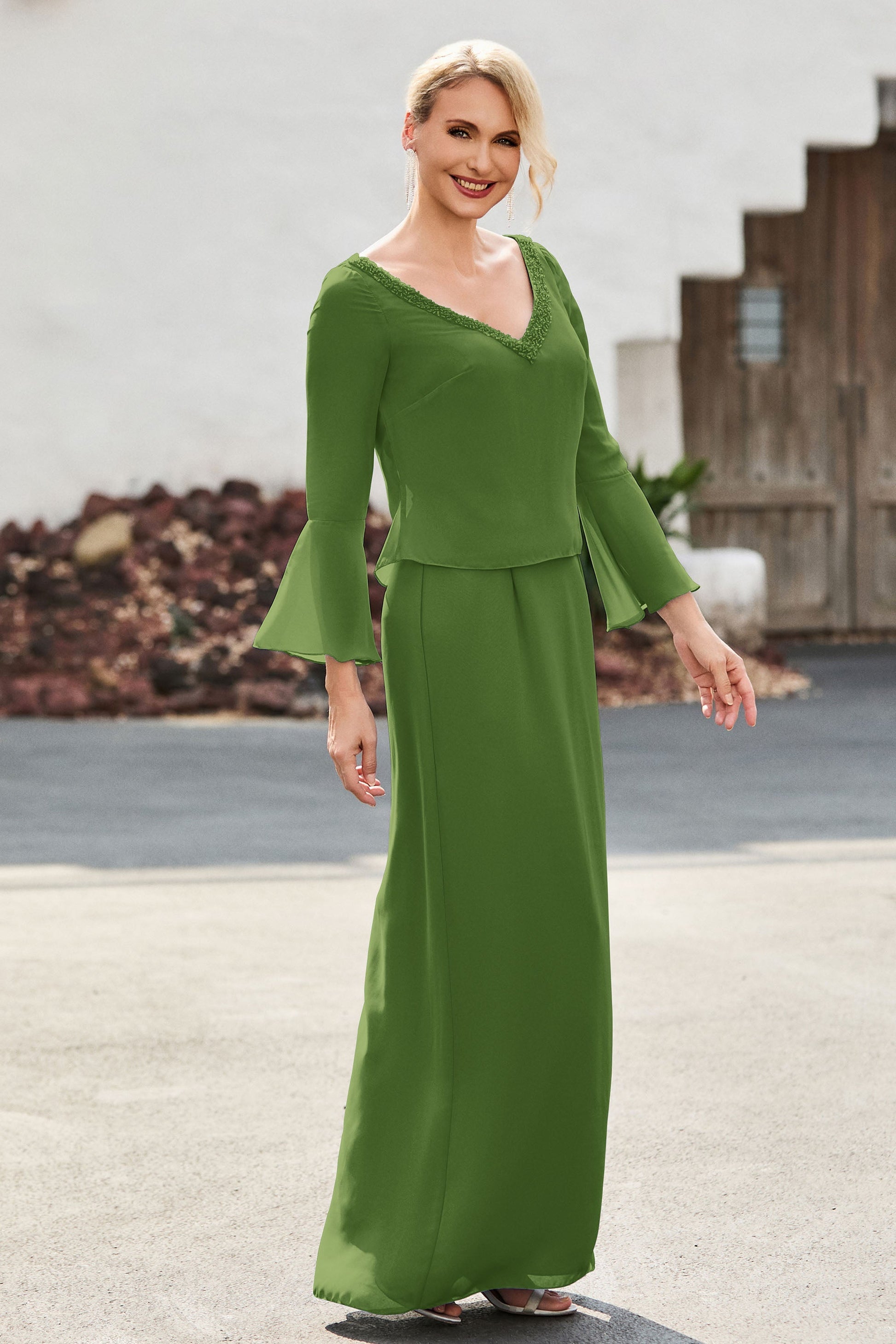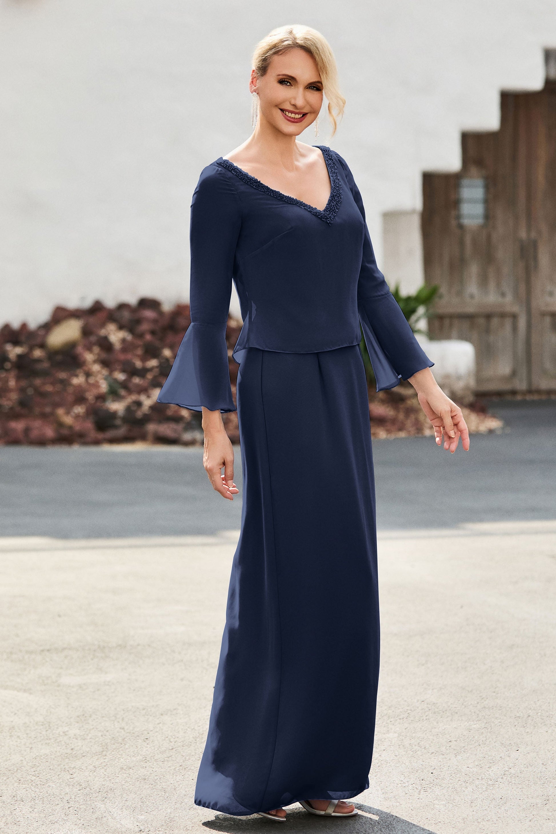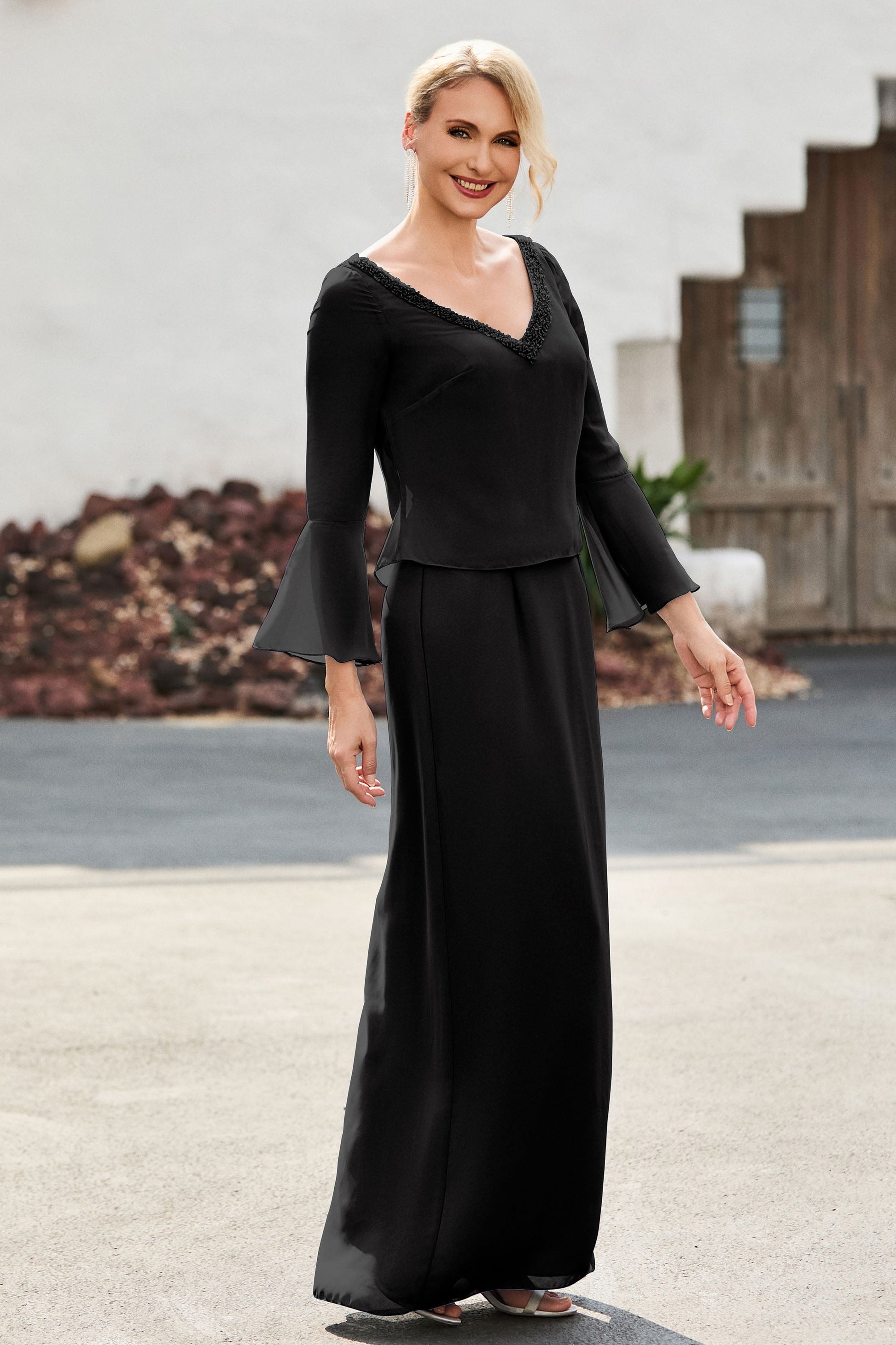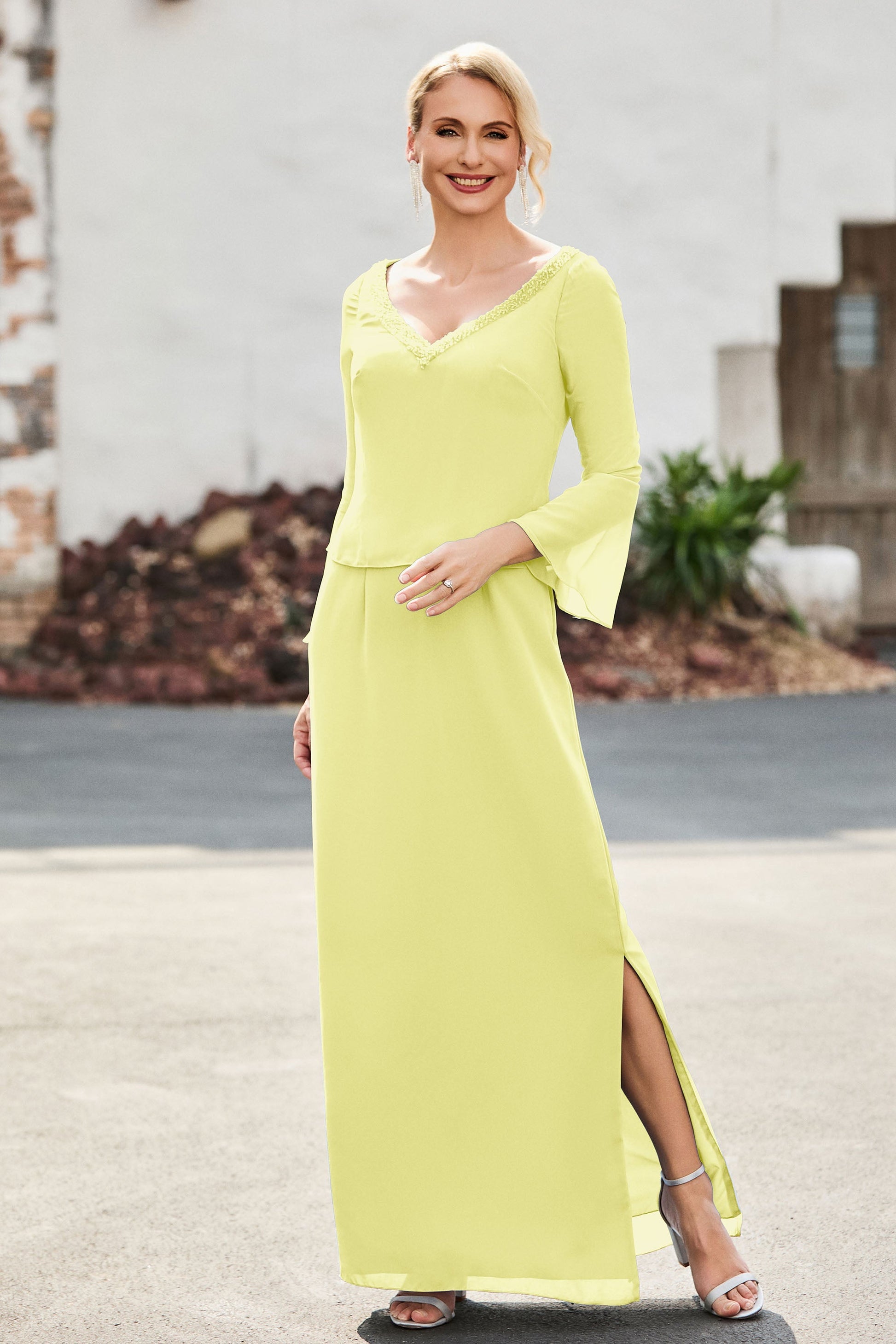 This dress features a flattering sheath silhouette, with a beaded v-neckline that exudes sophistication. A side slit adds graceful movement, while delicate beaded embellishments provide a hint of sparkle, enhancing its elegant charm. Perfect for formal occasions, this dress blends timeless style with modern glamour.