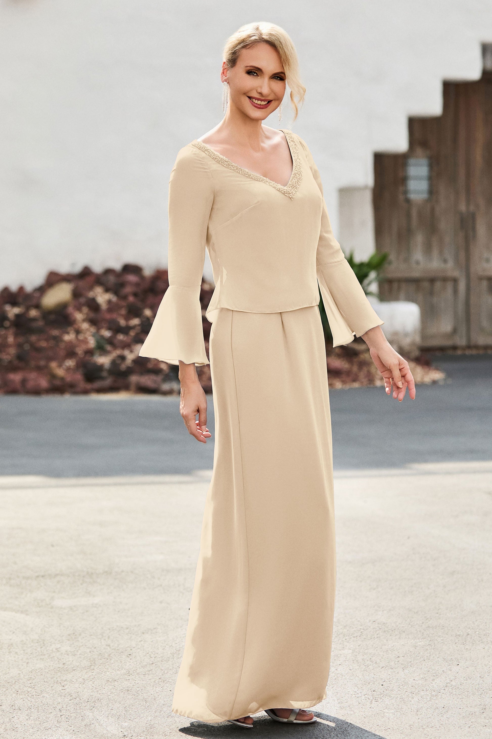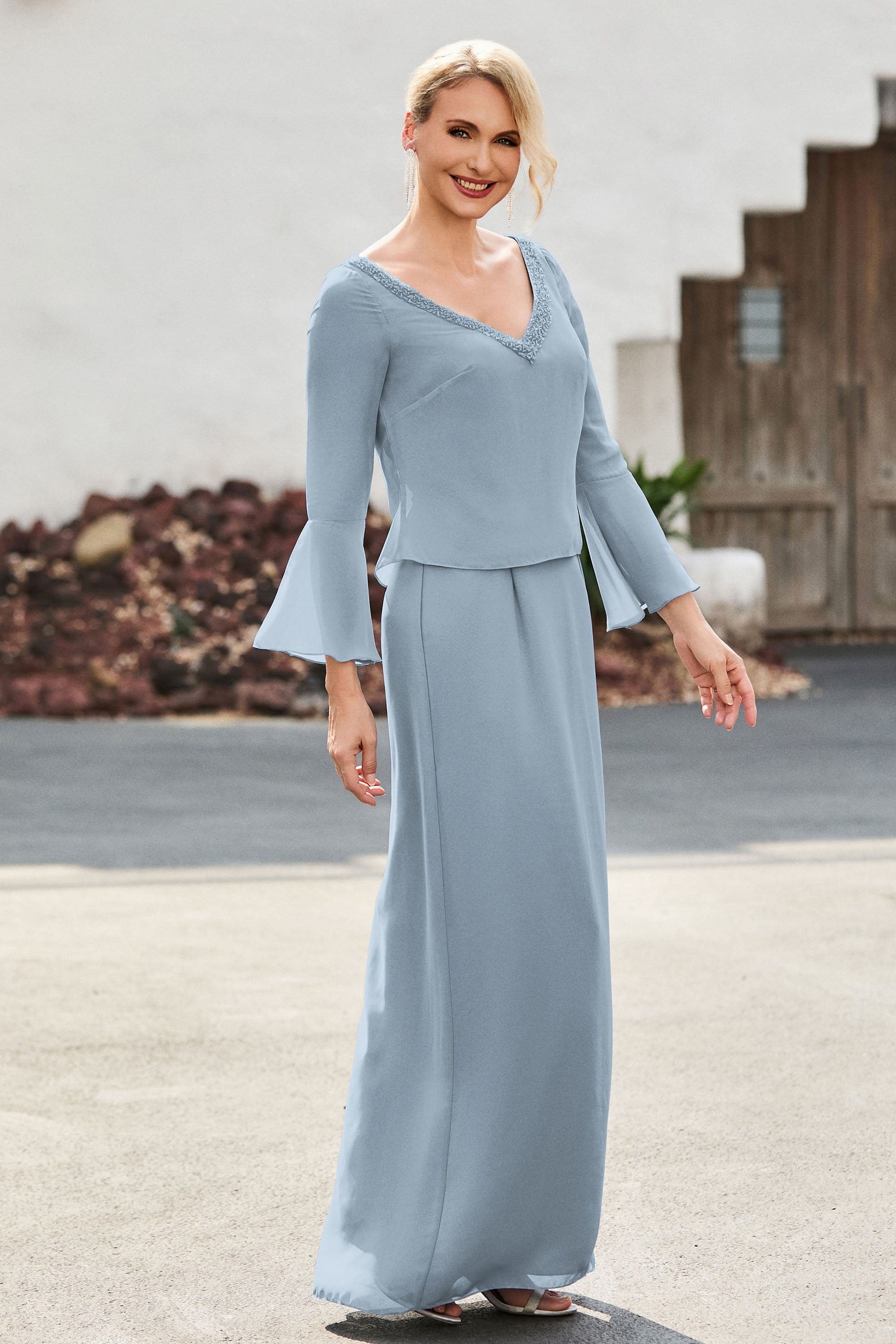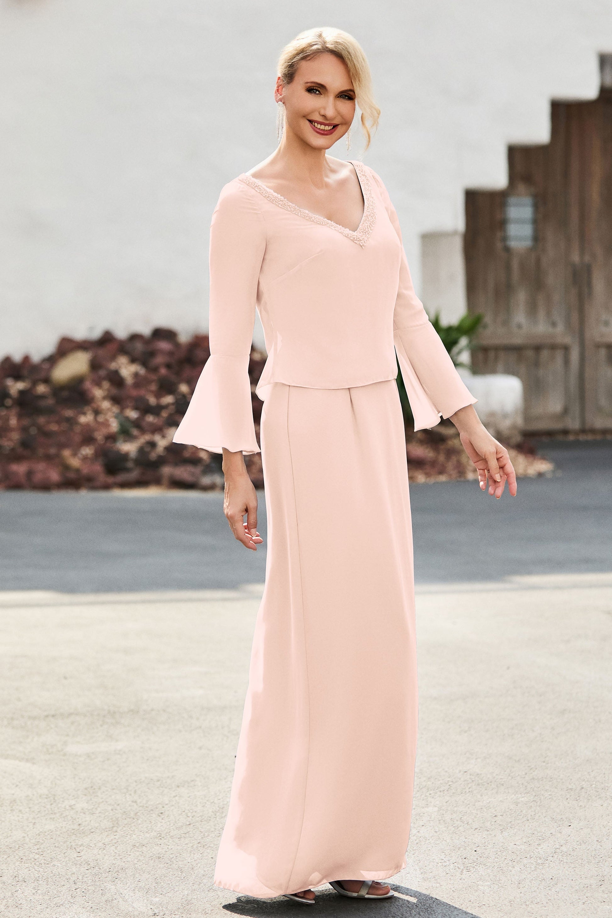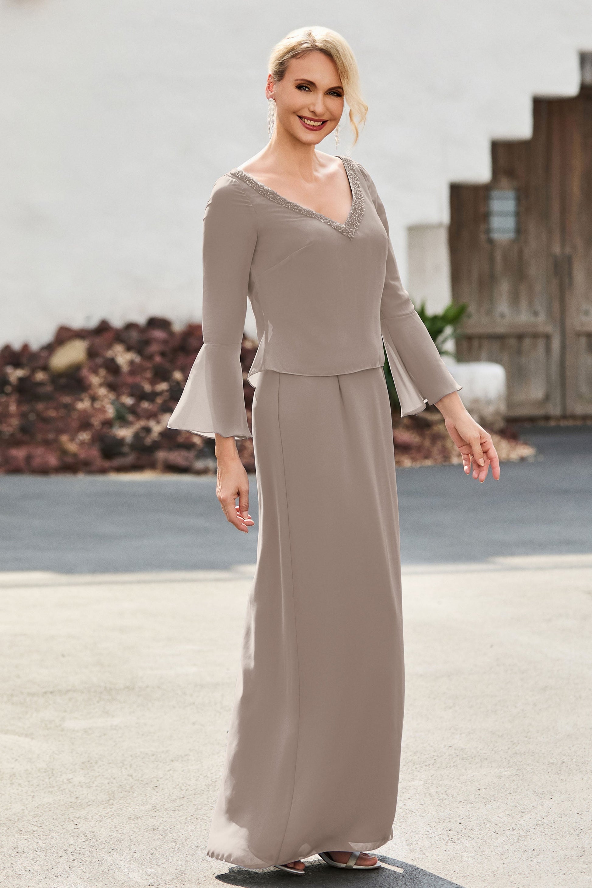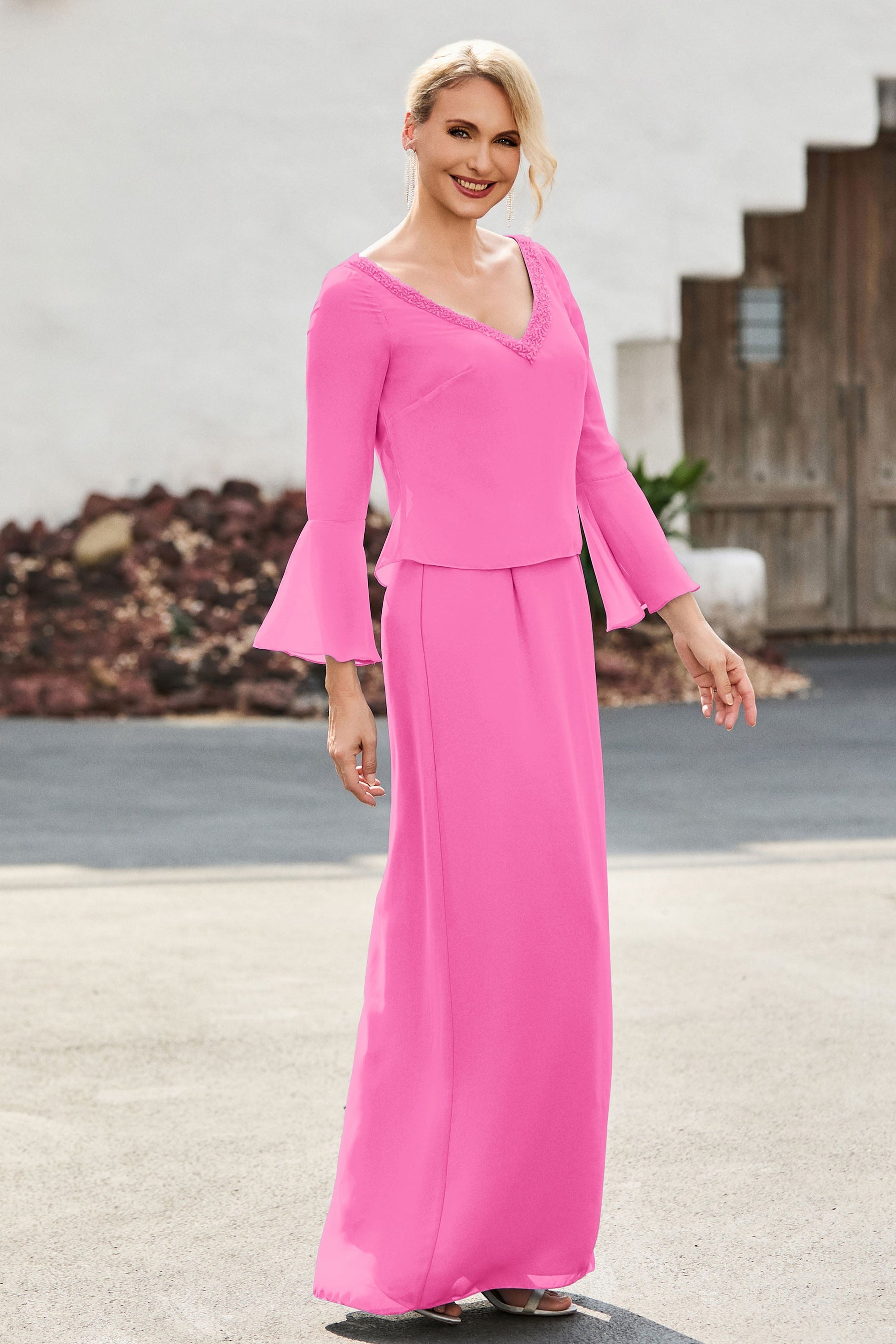 This dress features a flattering sheath silhouette, with a beaded v-neckline that exudes sophistication. A side slit adds graceful movement, while delicate beaded embellishments provide a hint of sparkle, enhancing its elegant charm. Perfect for formal occasions, this dress blends timeless style with modern glamour.