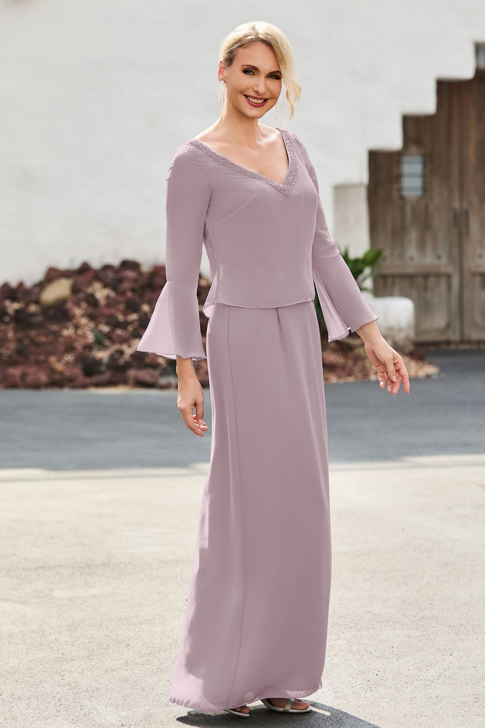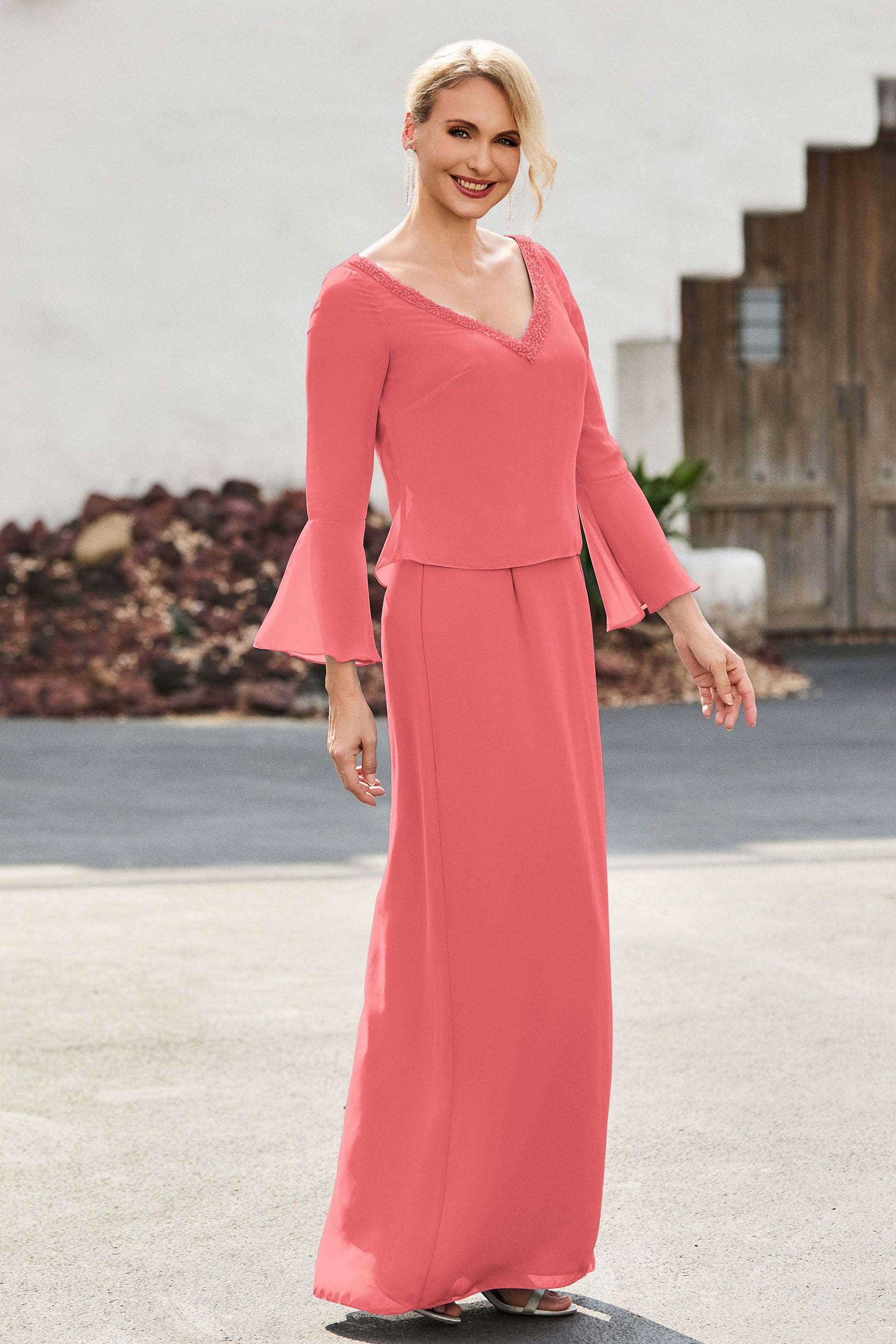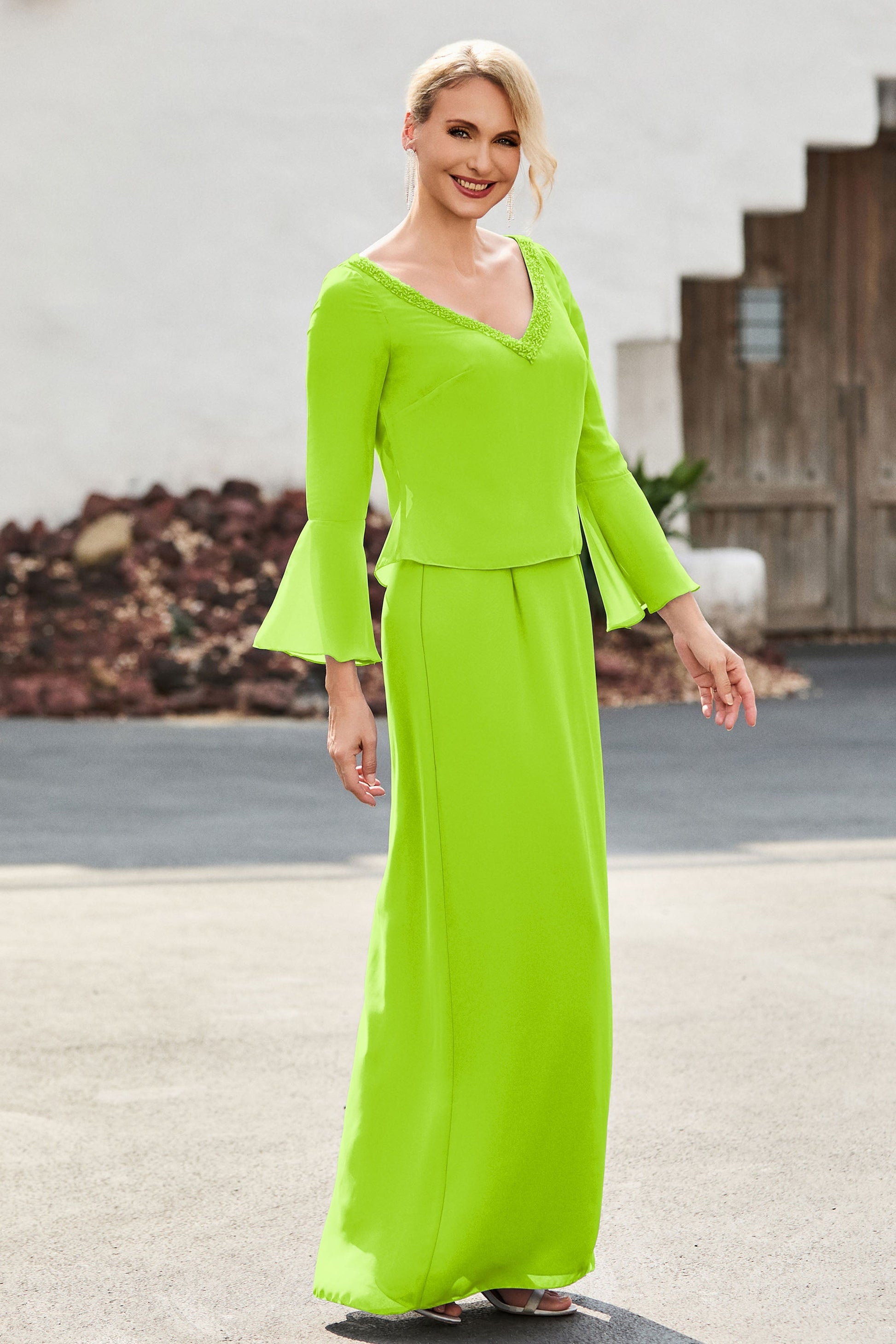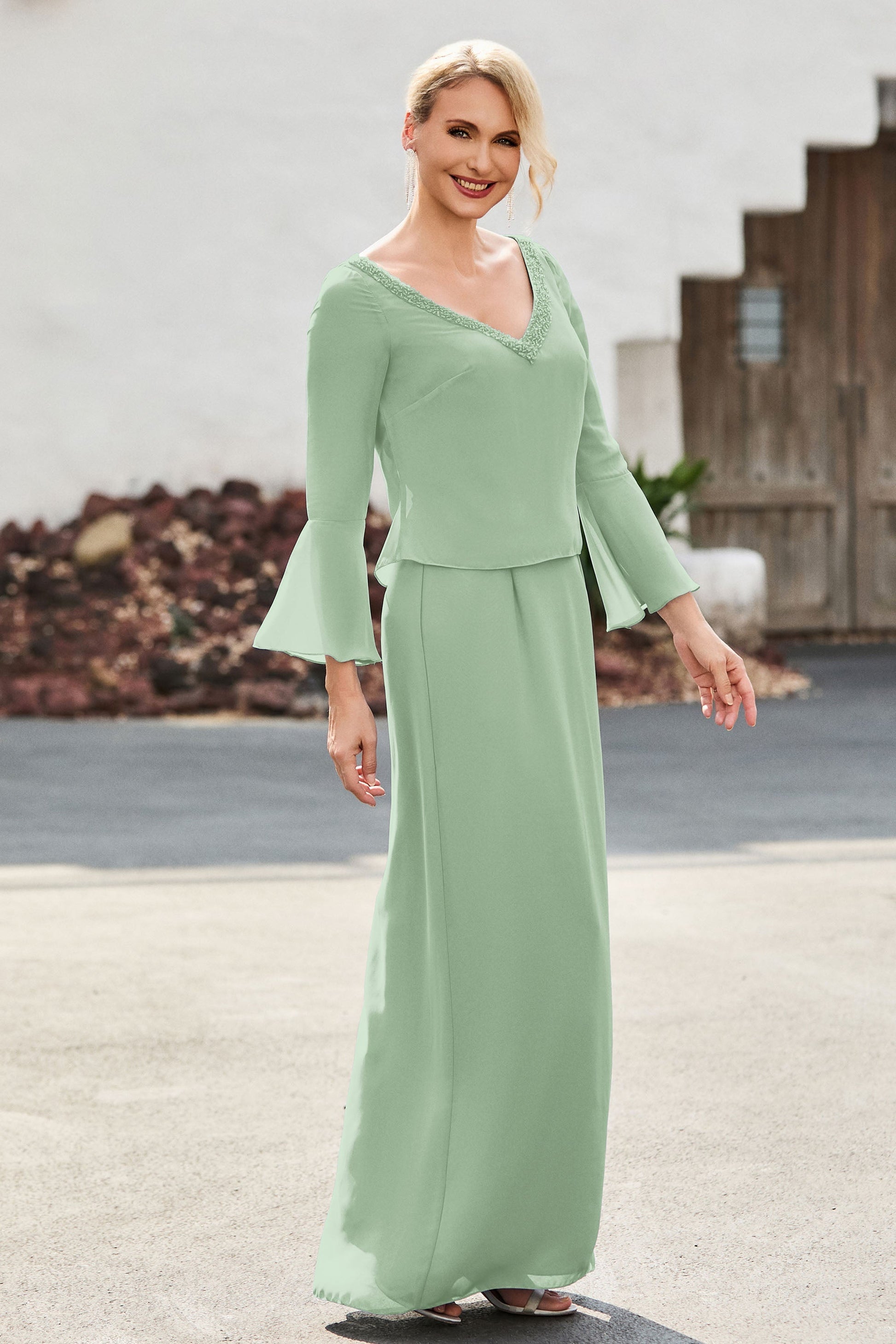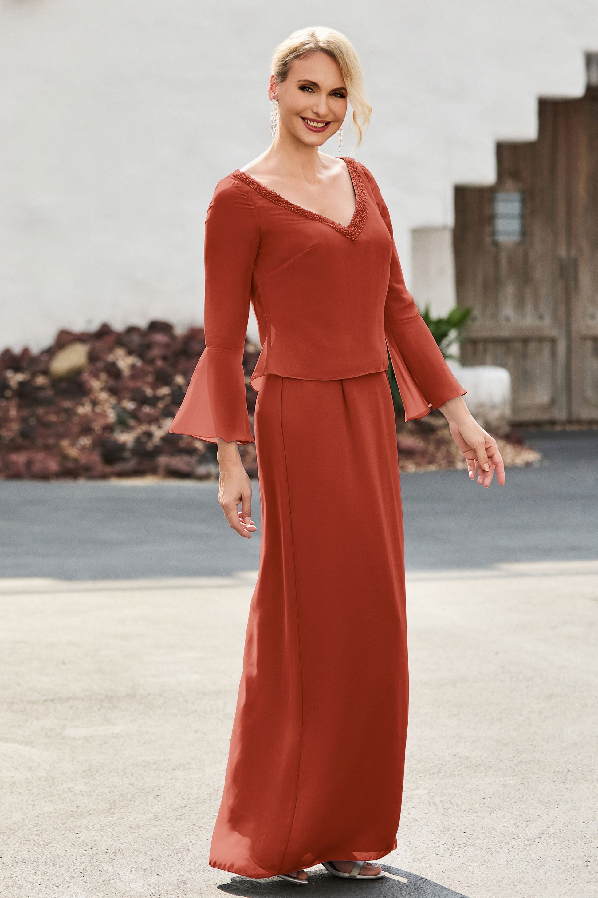 This dress features a flattering sheath silhouette, with a beaded v-neckline that exudes sophistication. A side slit adds graceful movement, while delicate beaded embellishments provide a hint of sparkle, enhancing its elegant charm. Perfect for formal occasions, this dress blends timeless style with modern glamour.