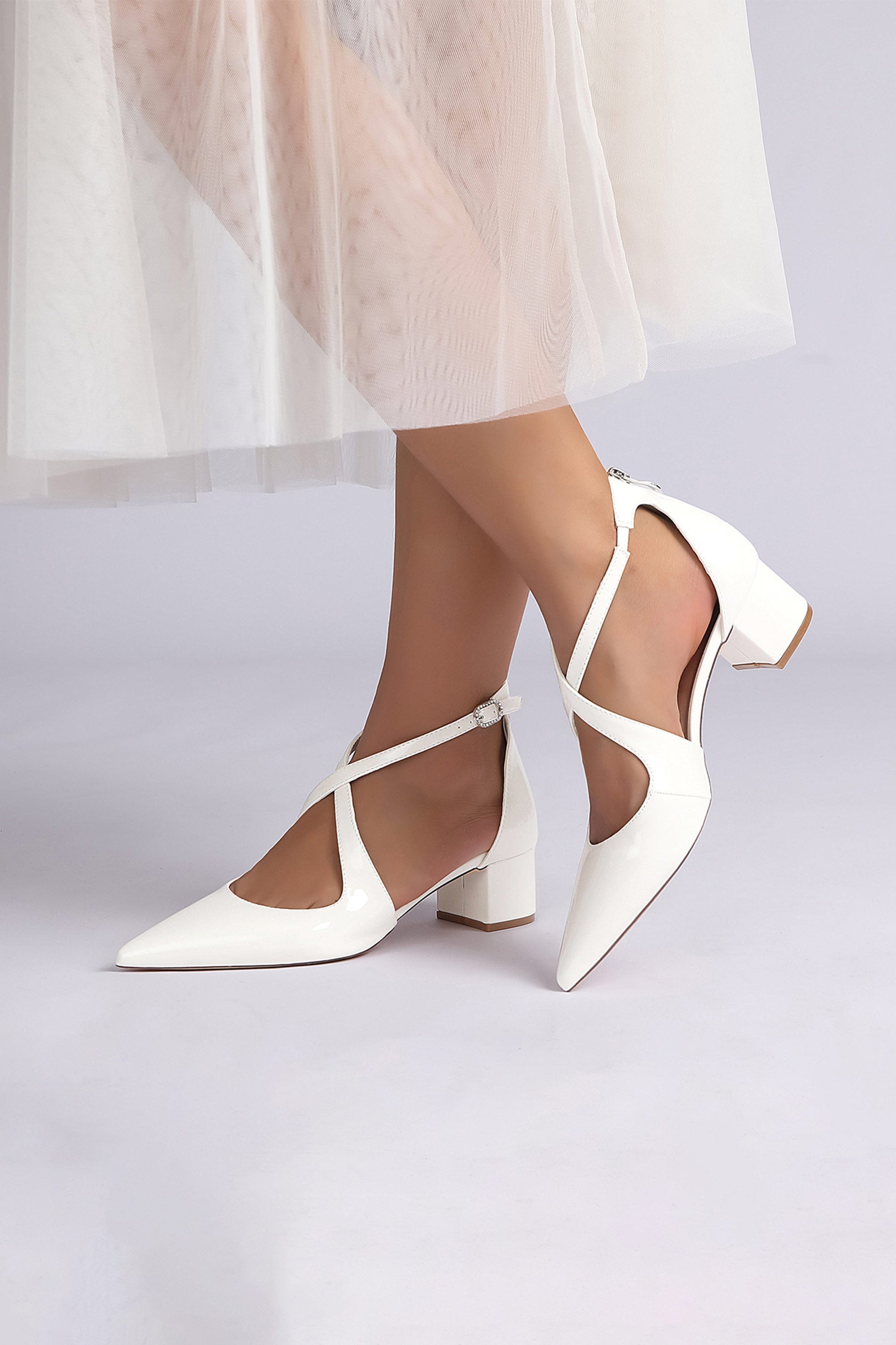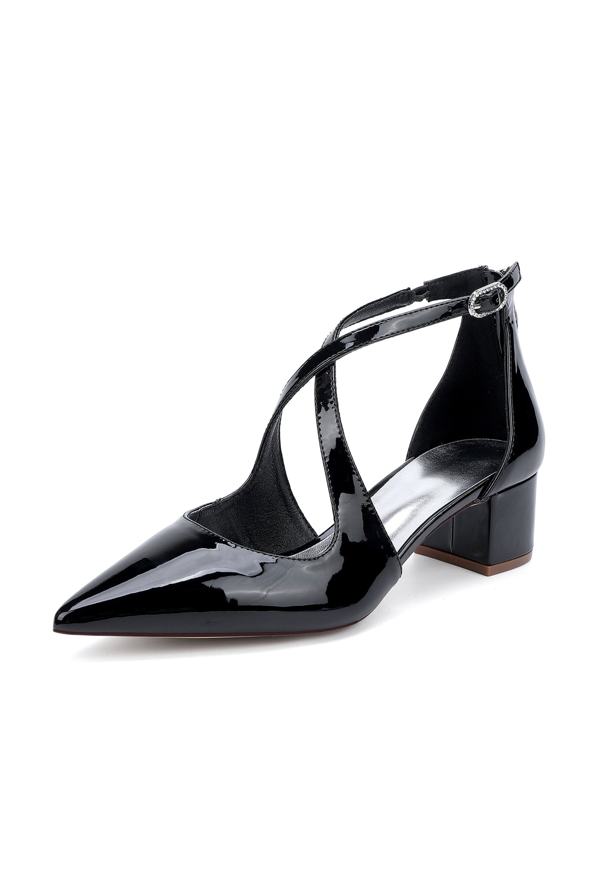 Featuring a sleek pointed toe and elegant cross-strap design, these heels are crafted from glossy mirror-finish patent leather for a bold, polished look. The chunky heel provides stability and comfort, making them perfect for both day and night.