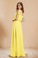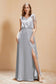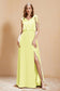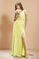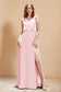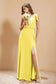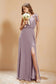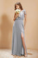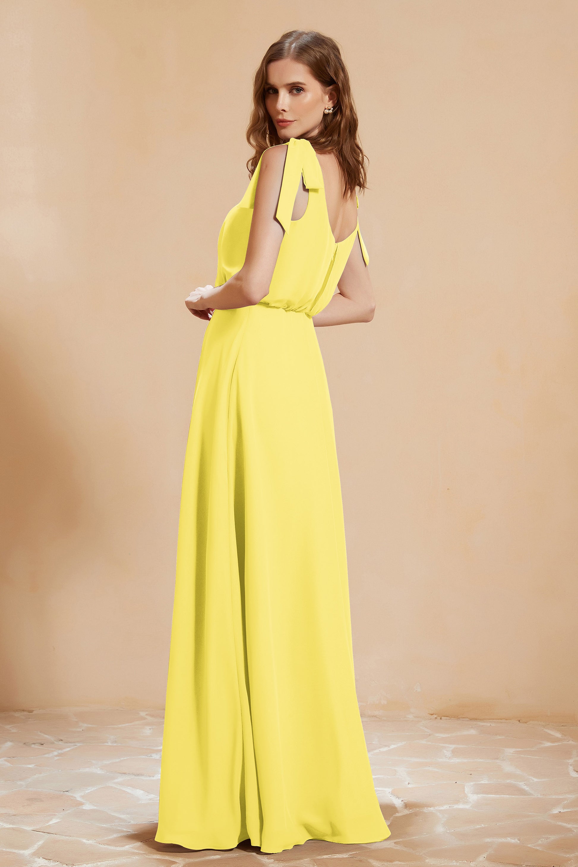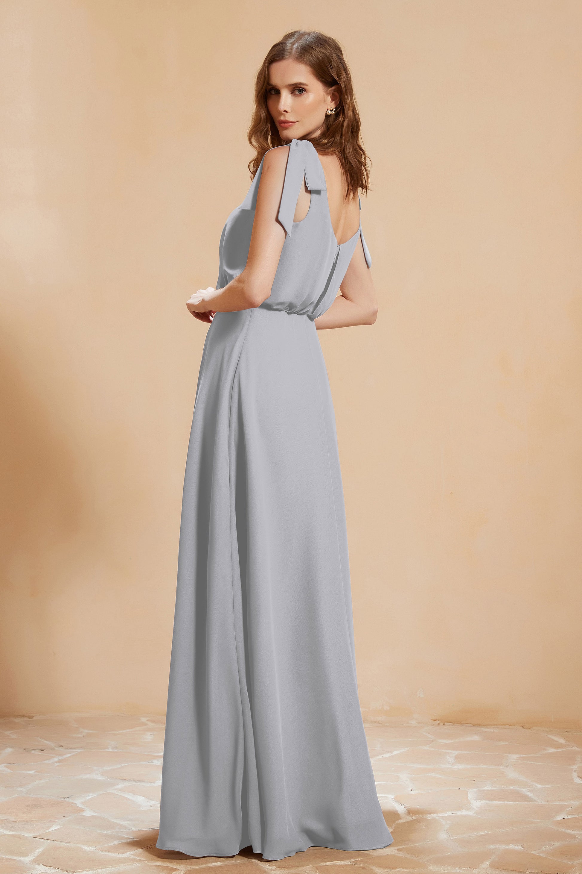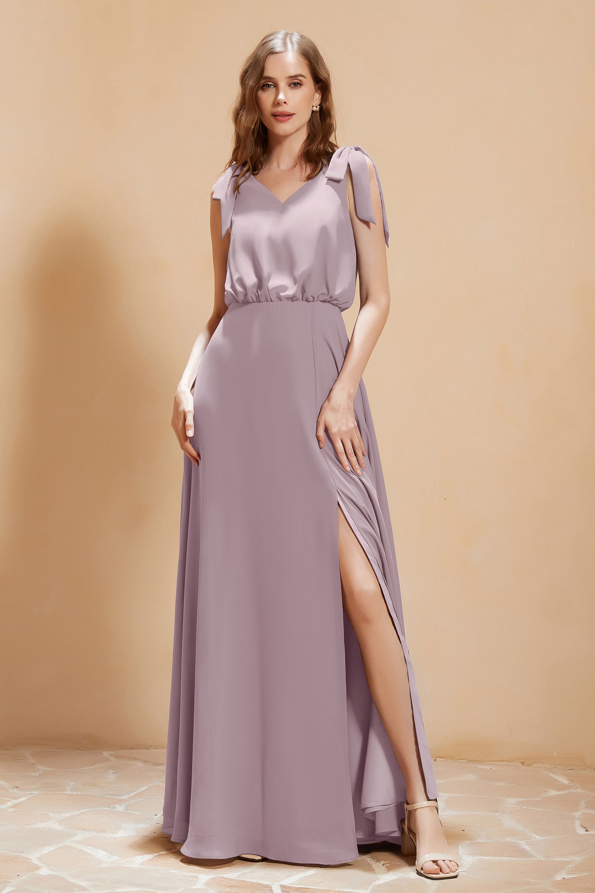This is a lovely bridesmaid dress cut from stretch chiffon. She features a v-neckline with tie straps and a cinched waist design. The look is complete with an A-line skirt and leg slit. Shop this dress for an amazing look!